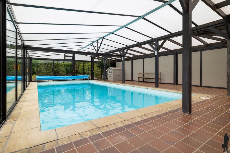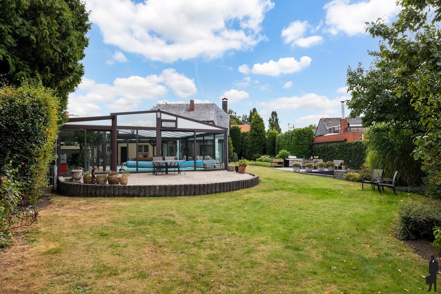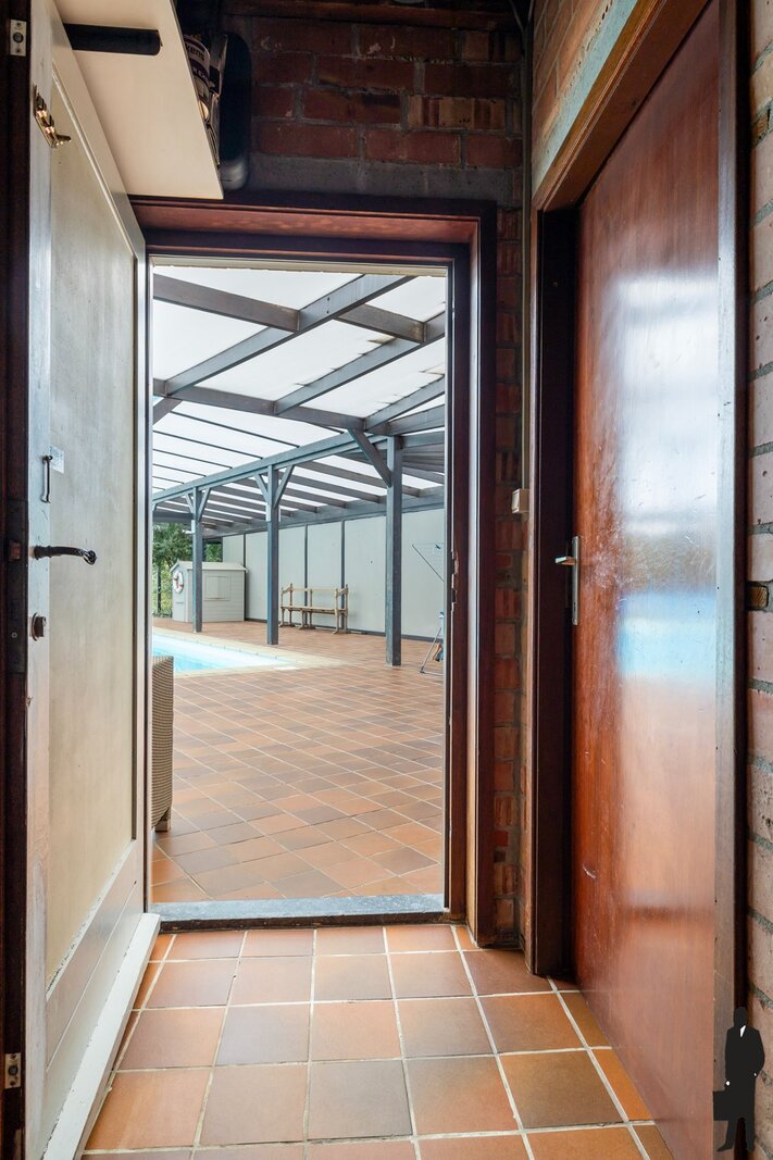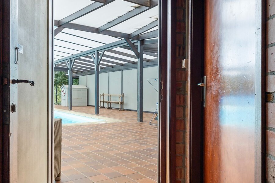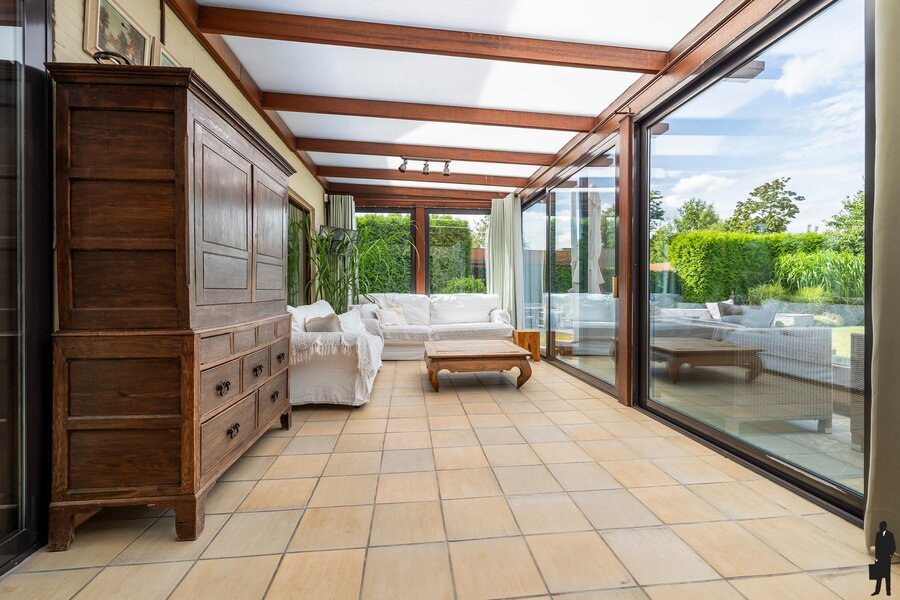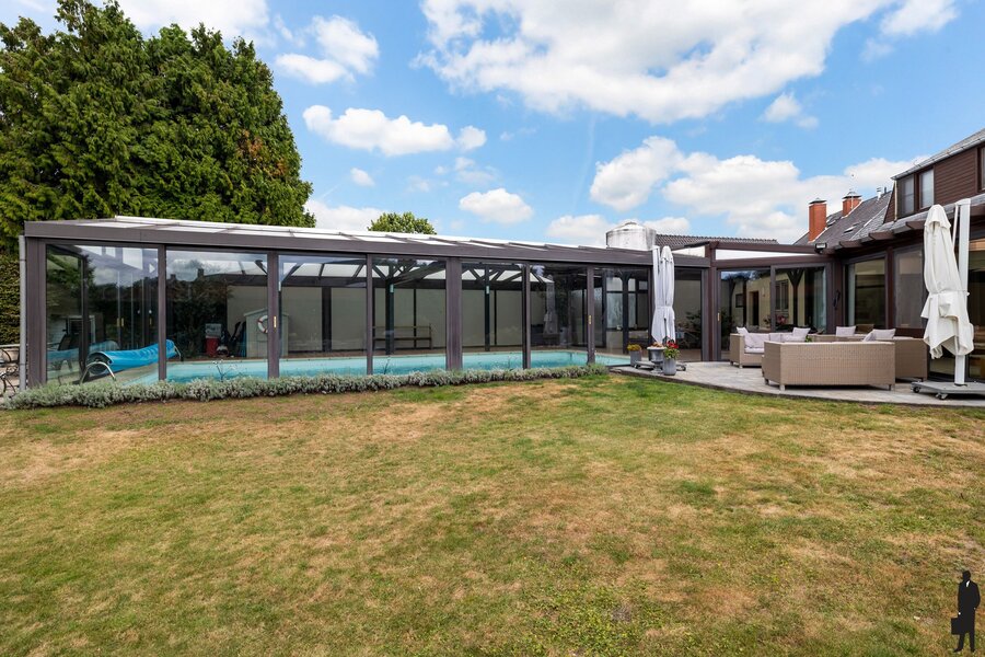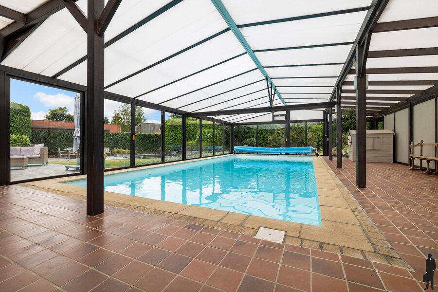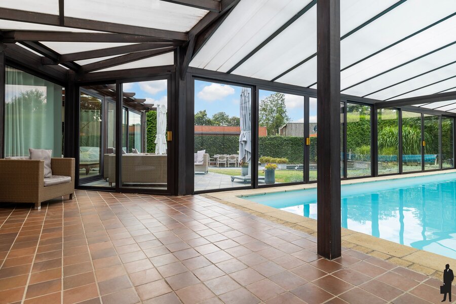 - Indrukwekkende ruimte (ca. 160 m²) met binnenzwembad en meerdere schuifpuien naar de achtertuin