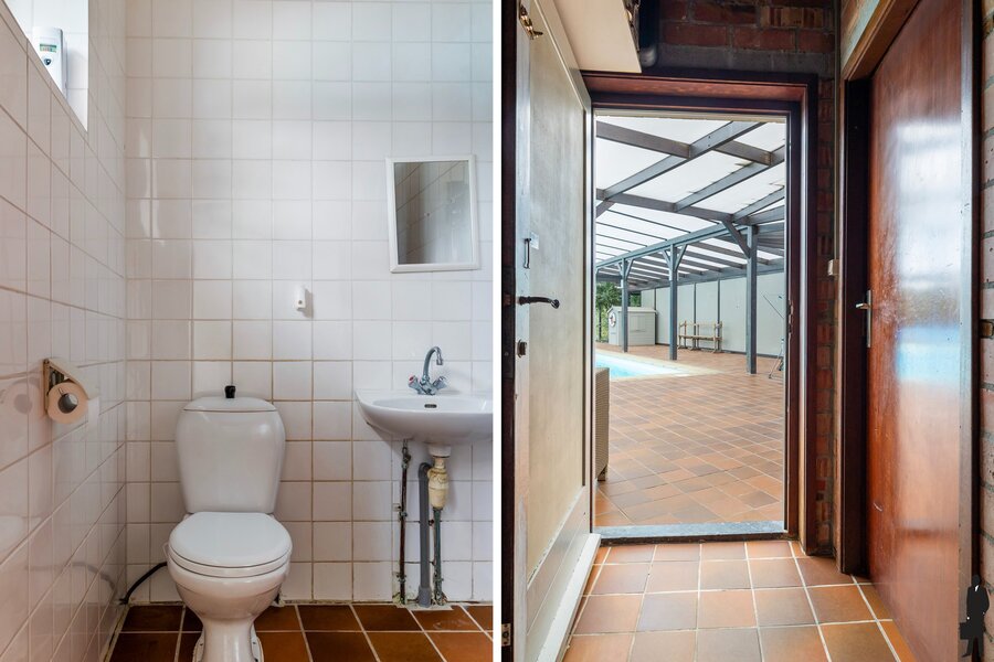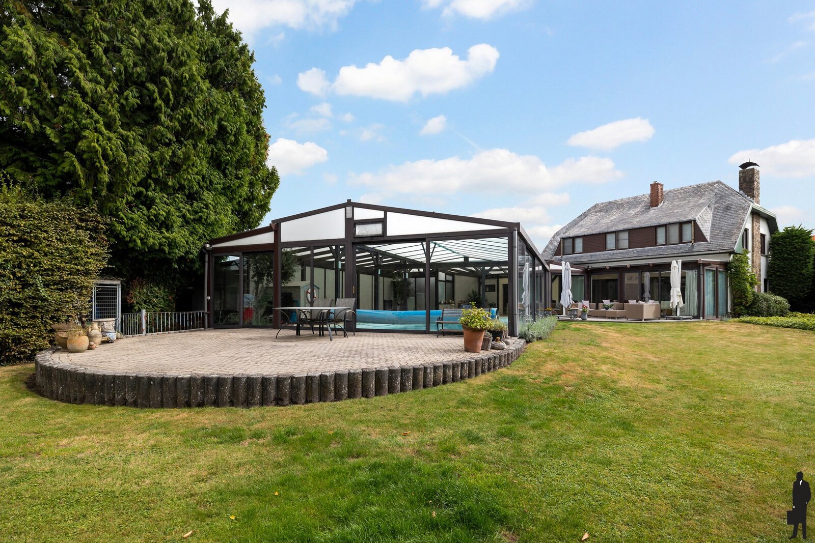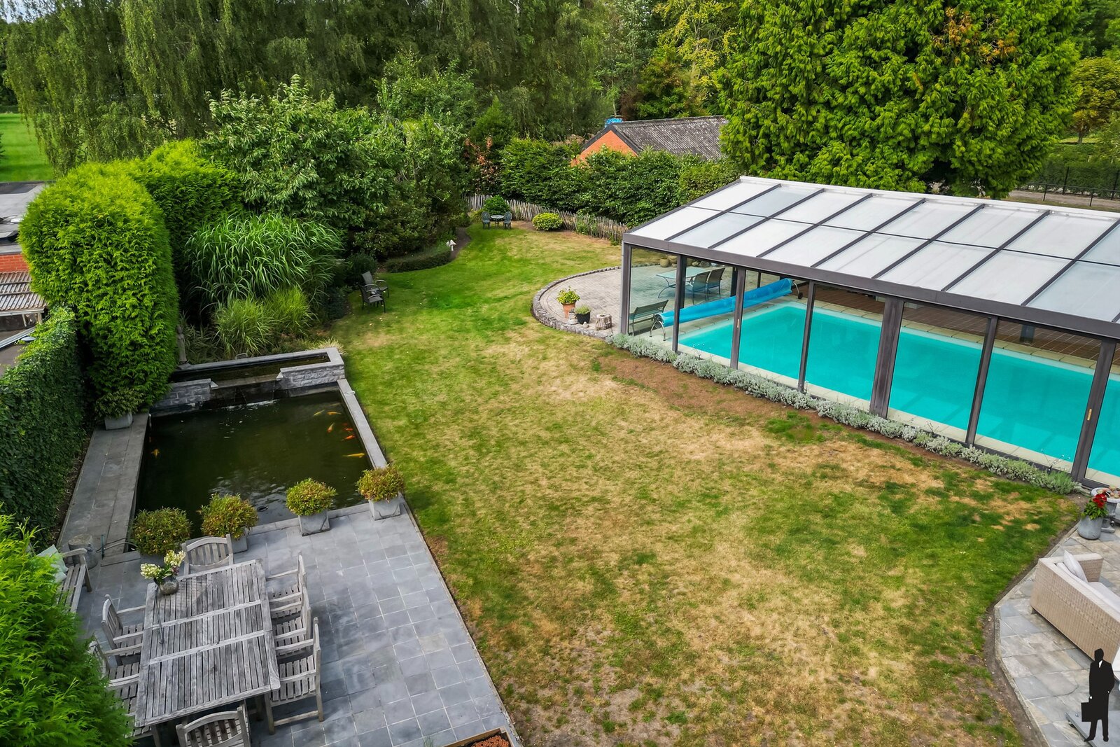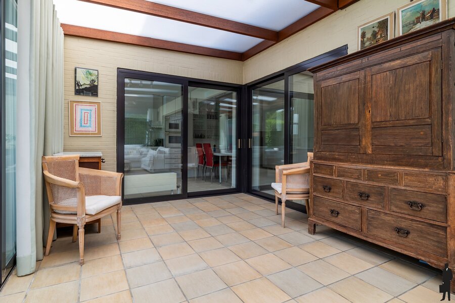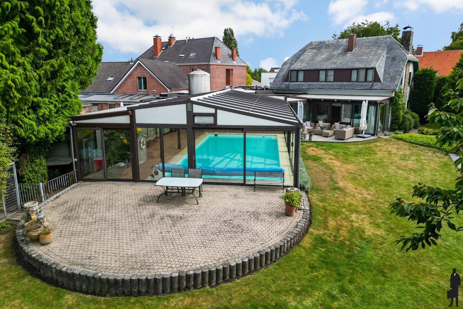 - Indrukwekkende ruimte (ca. 160 m²) met binnenzwembad en meerdere schuifpuien naar de achtertuin