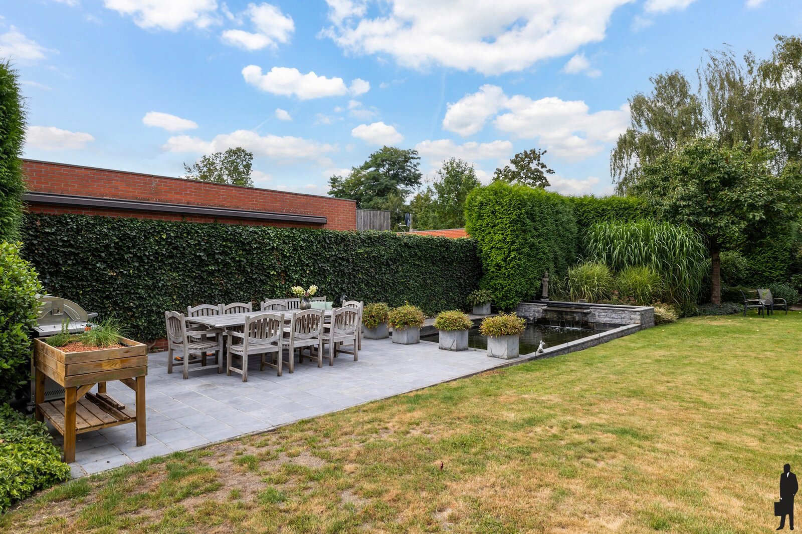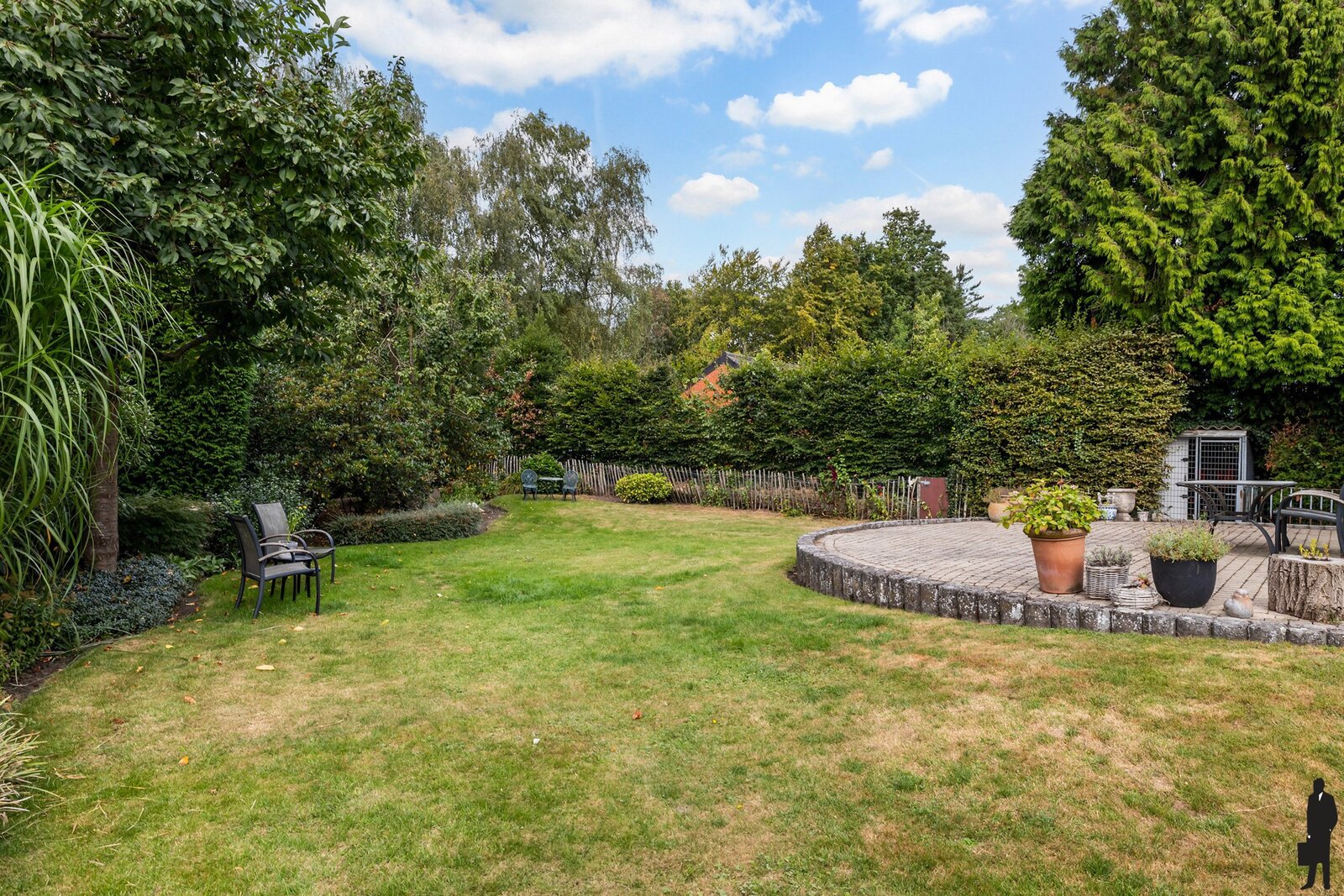 De fraai aangelegde, parkachtige achtertuin biedt volledige privacy en is gesitueerd op het westen. Hier vind je een groot terras, een vijverpartij, een royaal gazon en volwassen beplanting.