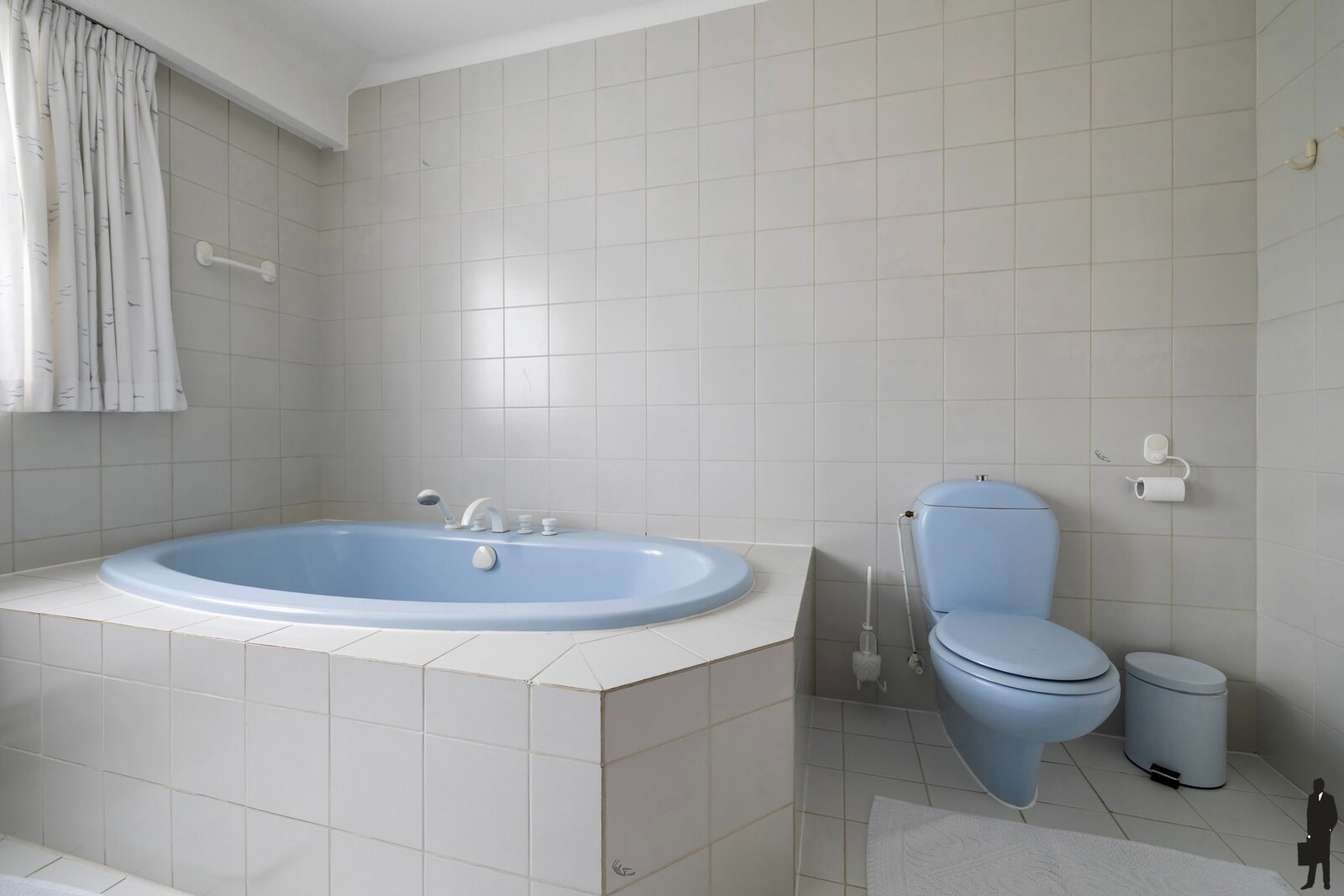 - Badkamer (ca. 2.99 x 3.37 m) met ovaal ligbad, douchecabine, toilet en wastafelmeubel