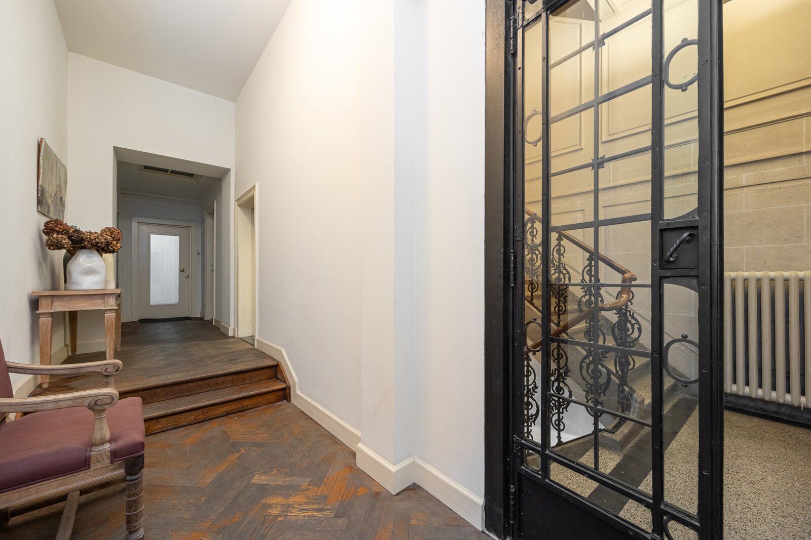 The living room has a warm, successful interior with parquet flooring, authentic stone floors and exceptionally high ceilings. Adjacent spacious covered terrace.
