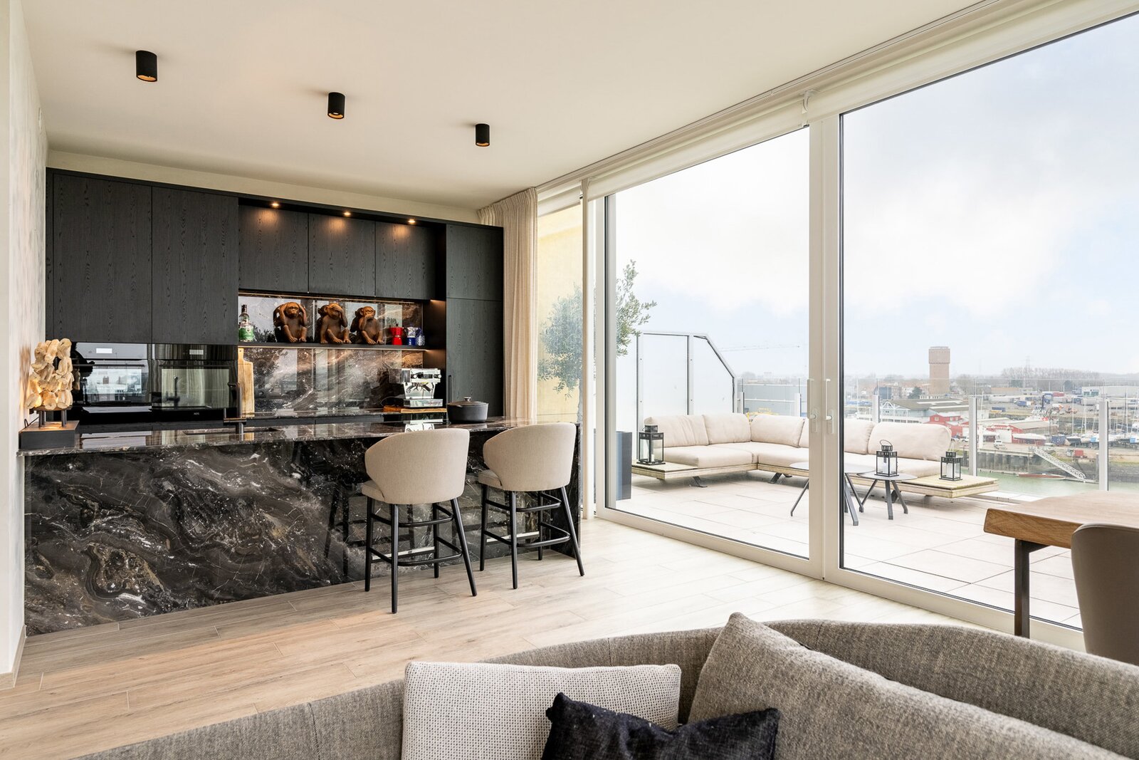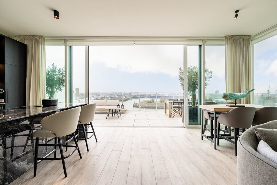 This exceptional residence offers breathtaking panoramic views of the marina entrance, the beach, and the North Sea—a rare combination of maritime dynamism and tranquility.