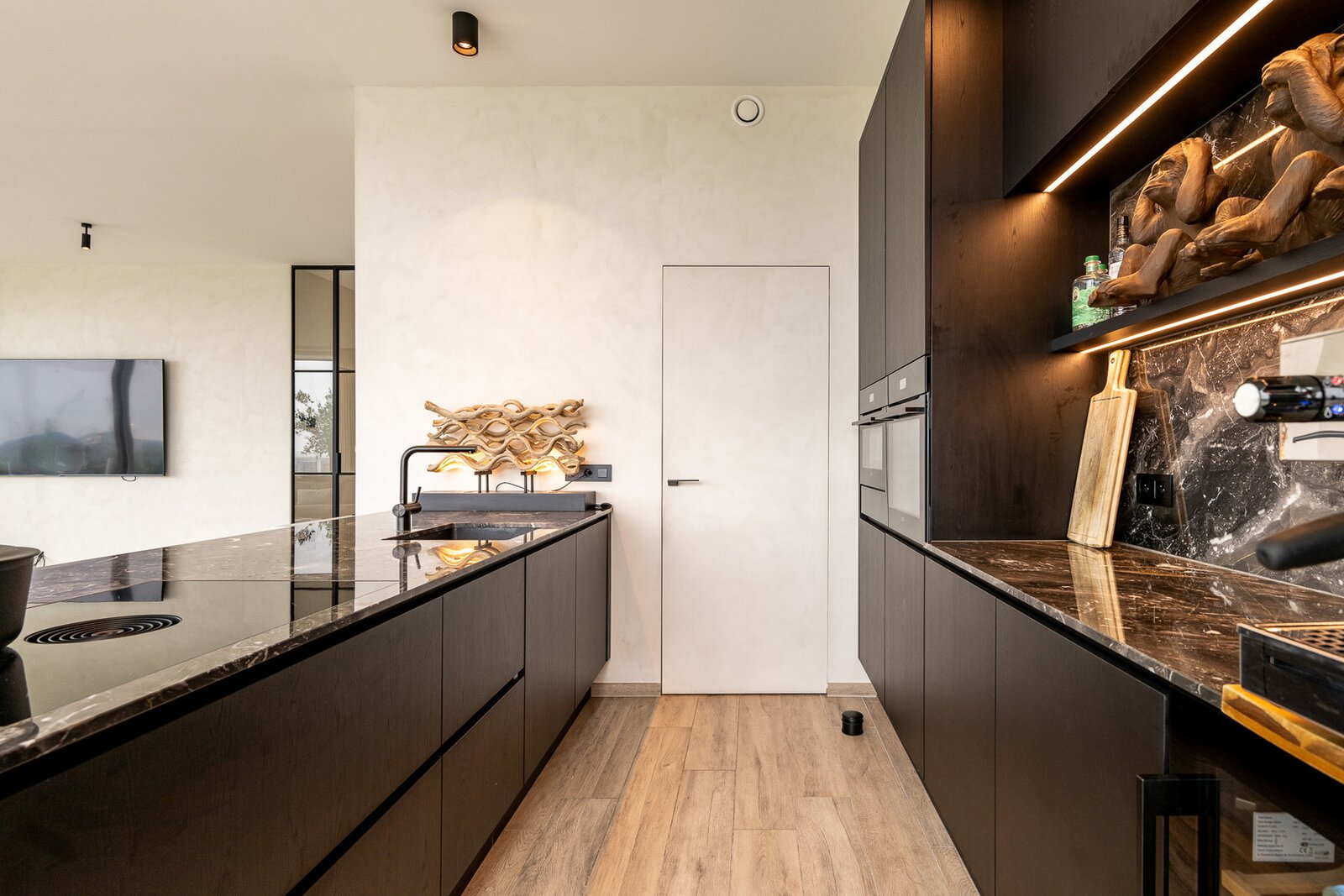 The open kitchen is an absolute eye-catcher and has been finished with high-quality marble materials. Adjacent to this is a practical extra storage room that further optimizes living comfort.