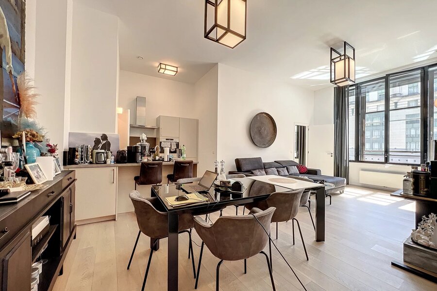 Ideally located in the heart of the historic city center, close to the Galerie de la Reine, the Grand Place and Brussels-Central train station, this furnished apartment with its high ceilings has a living area of 102 m².