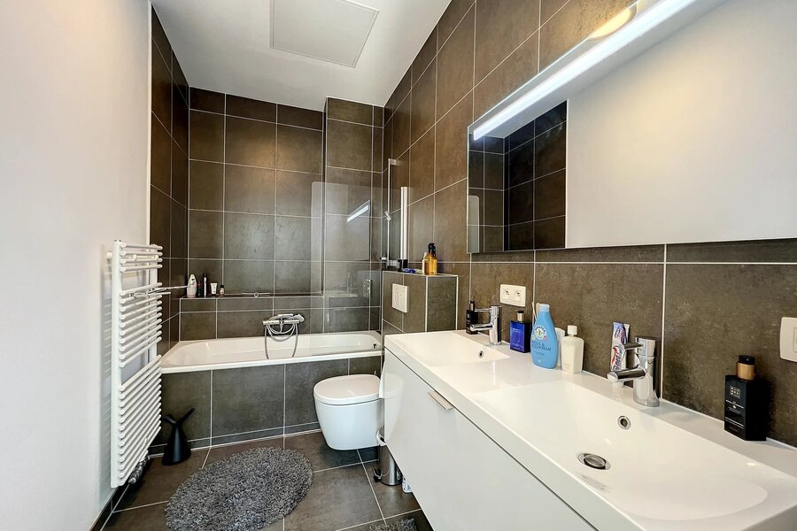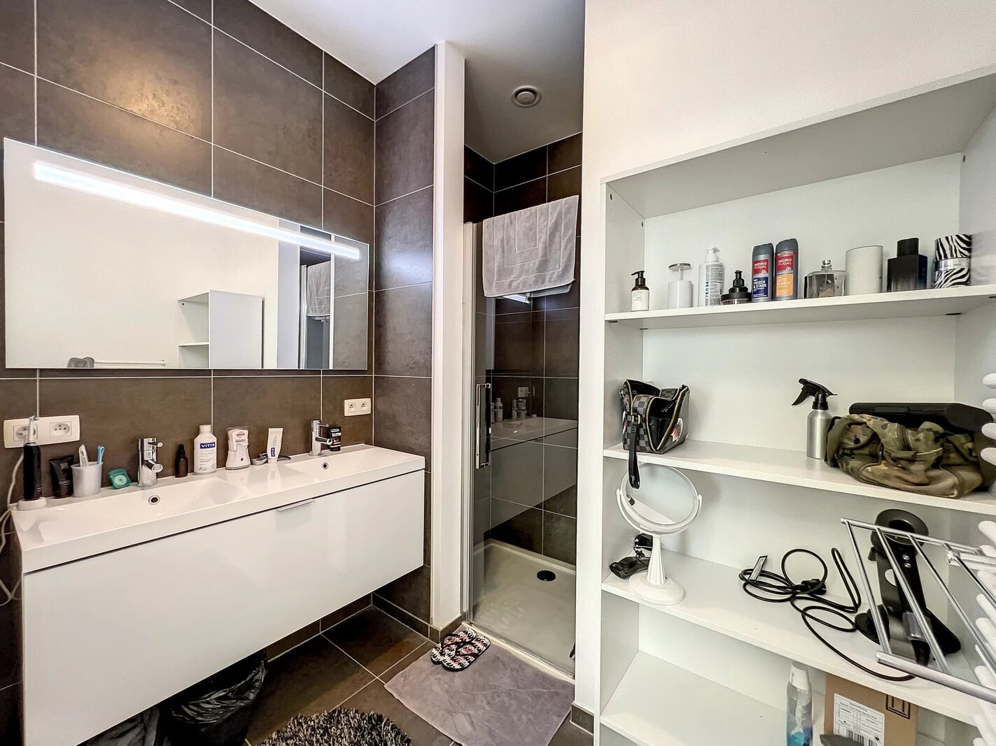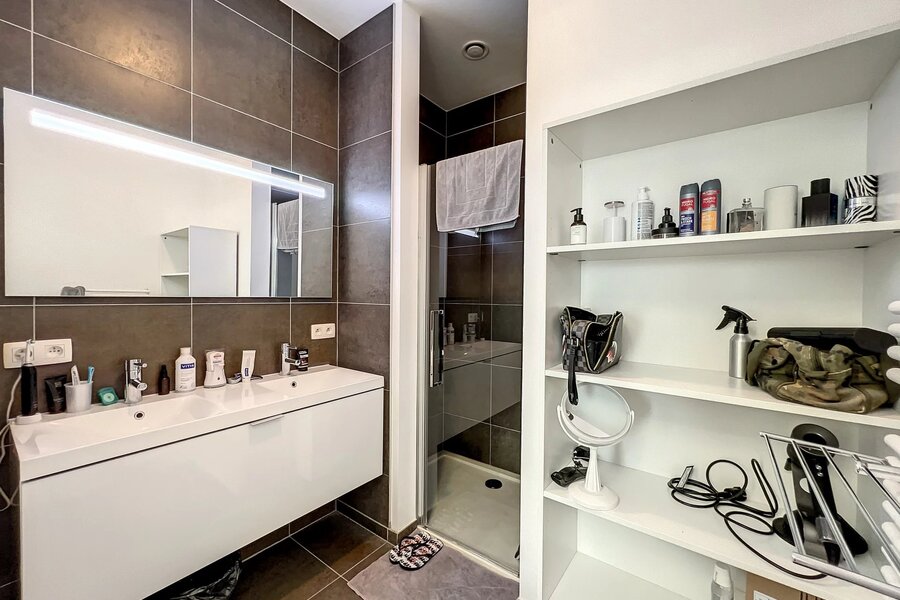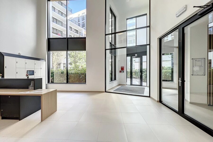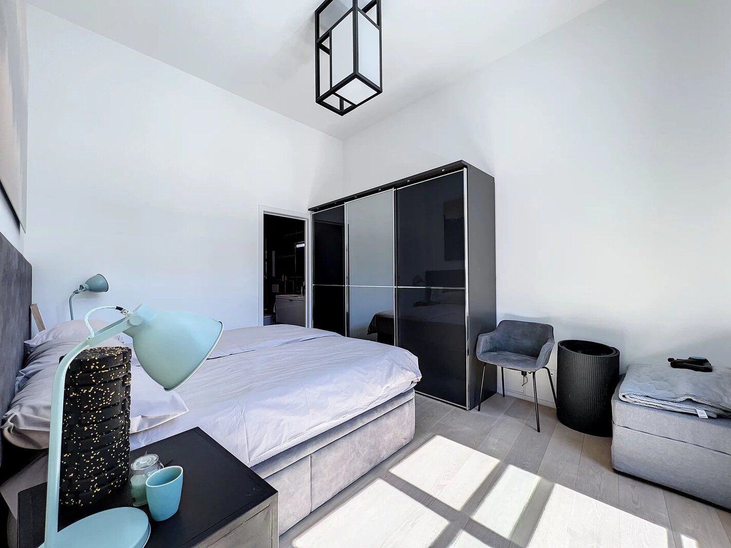 It comprises an entrance hall, a separate toilet, a large, bright living room with a fully equipped open-plan kitchen, 2 large bedrooms, 2 bathrooms, and a cellar. The apartment is currently rented, and a parking space can be sold as an option. Furniture is available for an additional €15,000.
