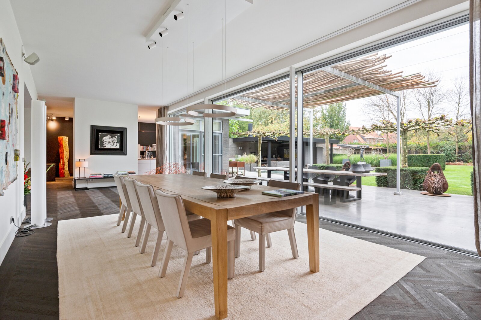 Inkomhal – gastentoilet – leefruimte met ruime ingerichte home office met zithoek (afsluitbaar) – salon met open haard – eetkamer met grote raampartijen en zicht op de tuin.
