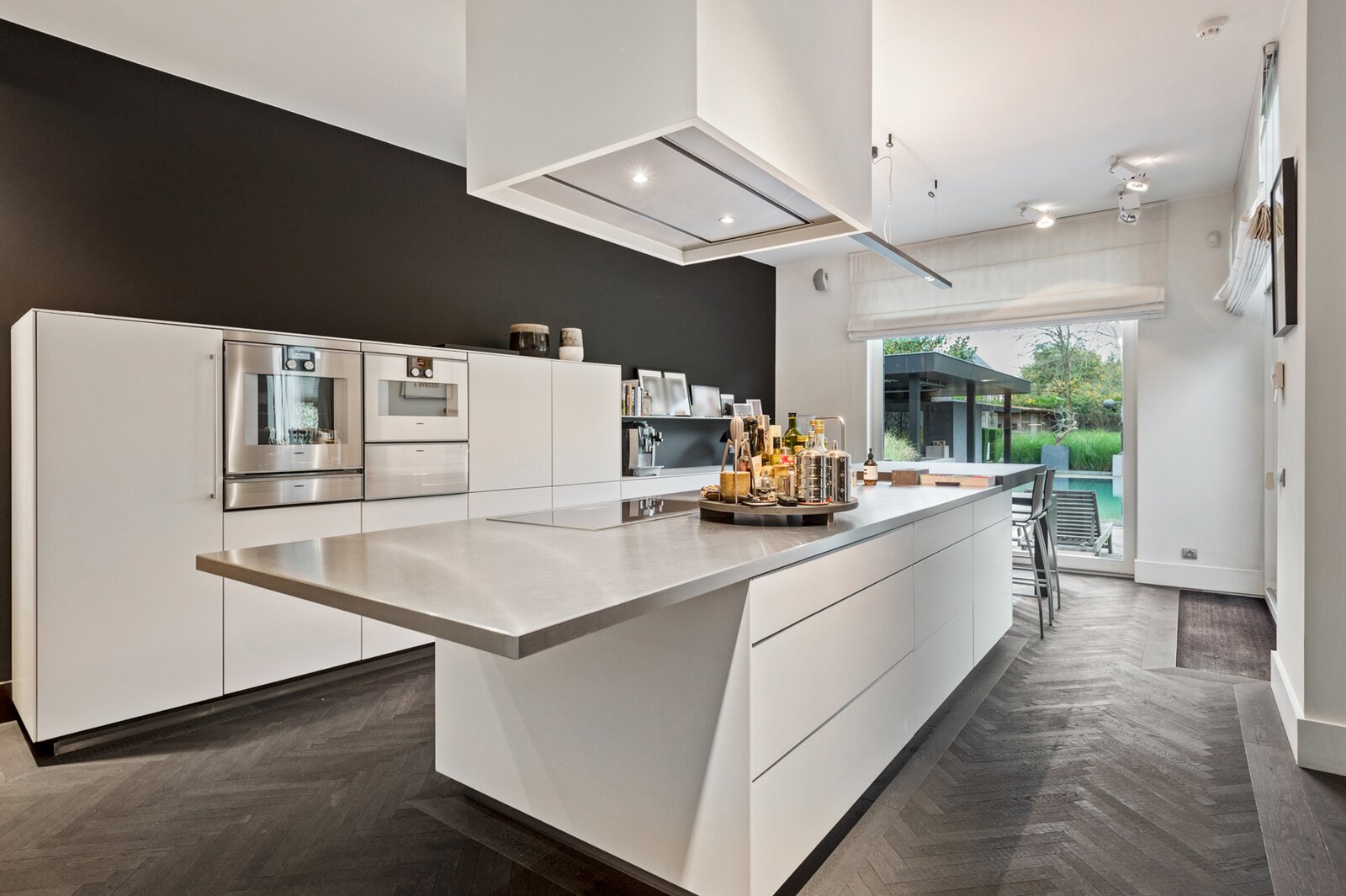 Enerzijds is er de zeer ruime, hyper-geïnstalleerde leefkeuken (Bulthaup) met werk- en eeteiland, open haard en airco. Aansluitend bevindt zich een grote bijkeuken met zij-ingang.