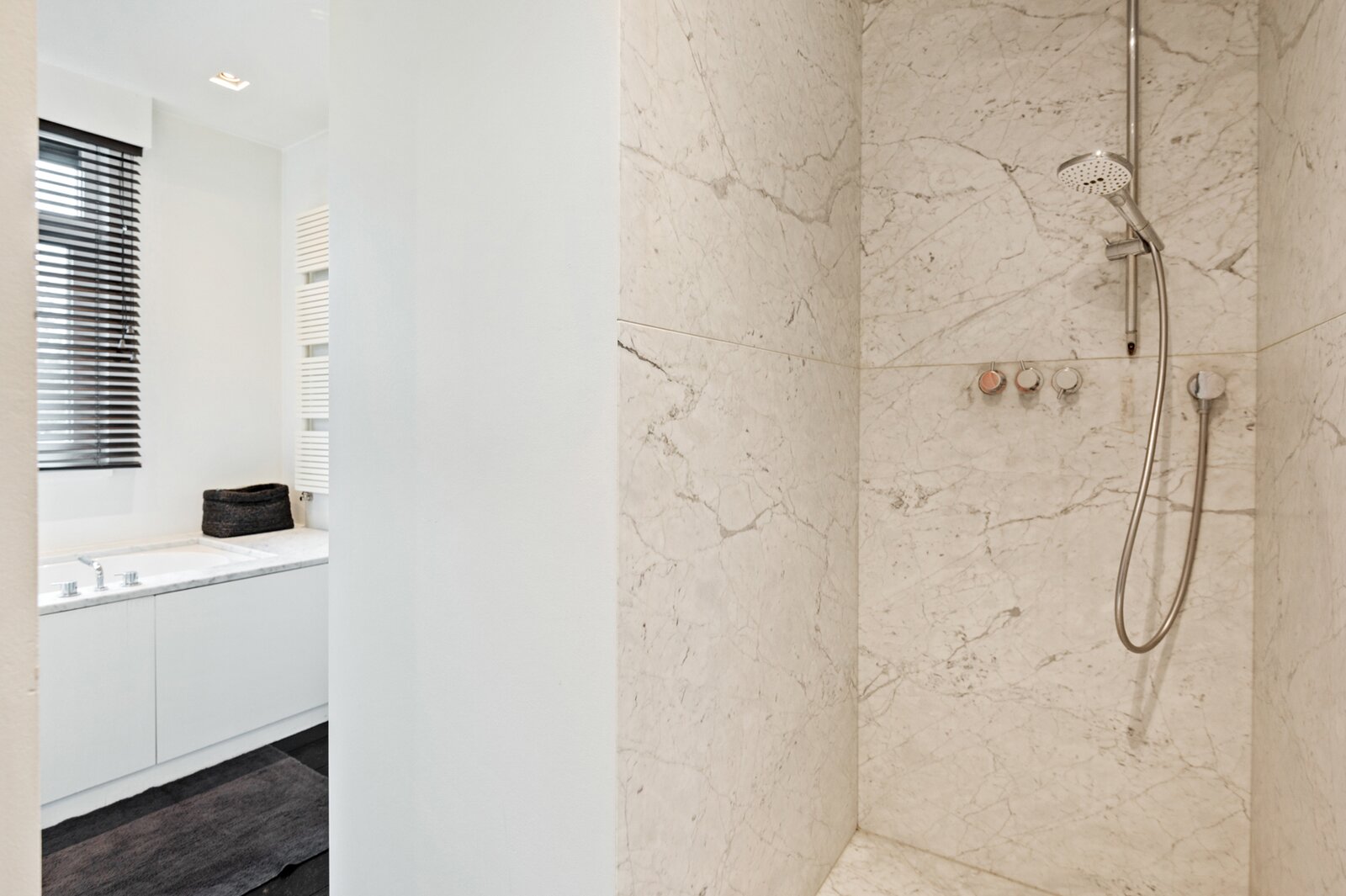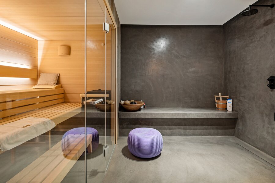 Aansluitend bevindt zich een wellnessruimte met sauna, infraroodcabine en douche. Verder is er toegang tot een kitchenette (Bulthaup) met zij-ingang en tot de tweede inkomhal met gastentoilet.