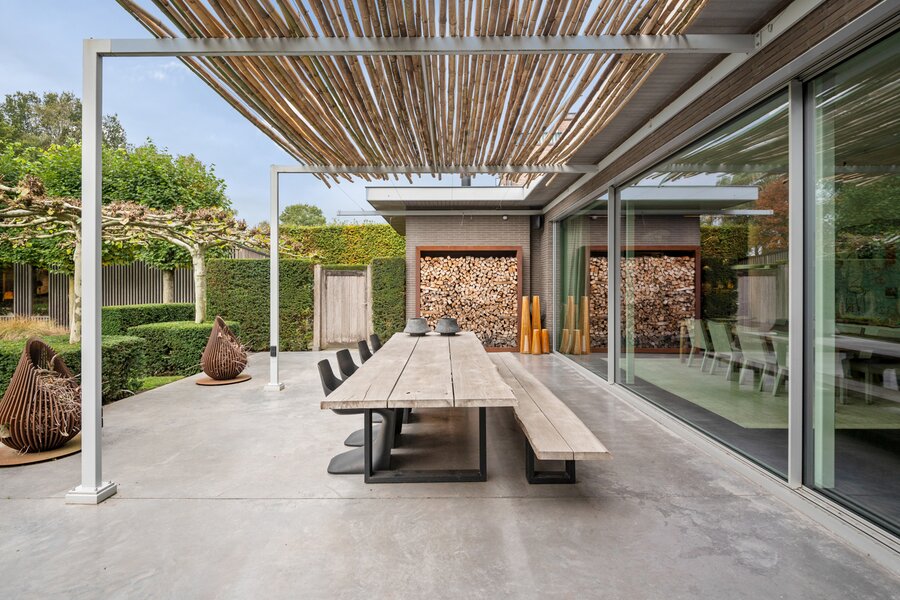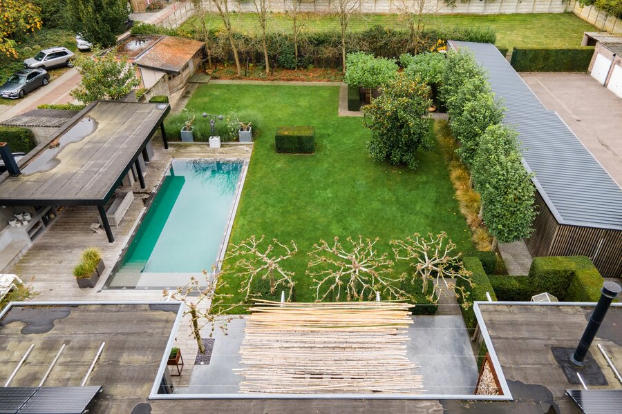 De tuin met prachtig terras beschikt over een verwarmd overloopzwembad (warmtepomp) met roldek (solarlamellen), buitendouche, poolhouse met open haard, tweede terras met dakplatanen, technische berging en een stijlvolle man cave (of garage). Daarnaast is er een extra overdekt terras. Achteraan bevinden zich twee garages en twee autostaanplaatsen, bereikbaar via de zijstraat.