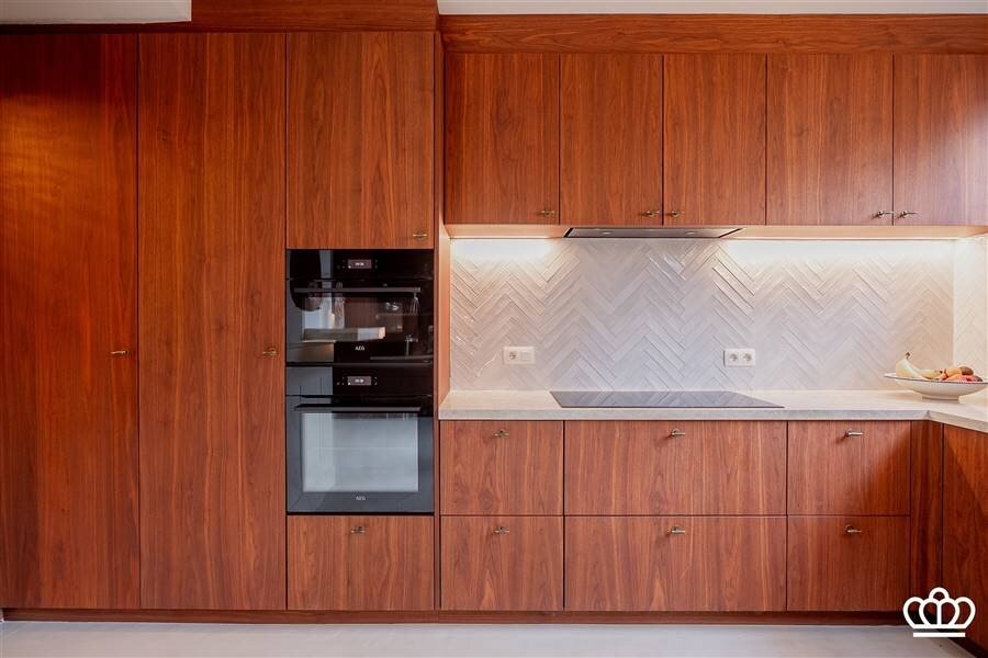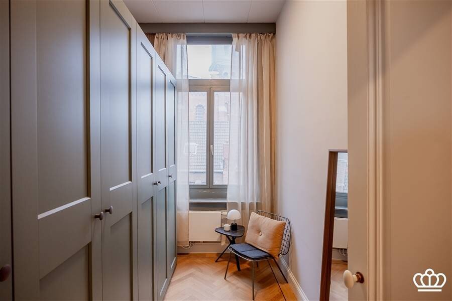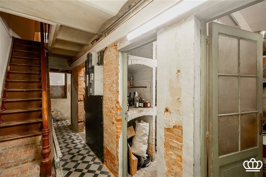 Bij het betreden van de woning komt u in de royale inkomhal, waar de hoge plafonds, authentieke wand- en plafonddetails en de marmeren vloer onmiddellijk de grandeur van dit herenhuis weerspiegelen. Hier bevindt zich een gastentoilet met handenwasser. Vanuit de inkomhal bereikt u de leefruimte op eikenhouten visgraatparket, harmonieus ingedeeld in een eetkamer en een zithoek, beide voorzien van een originele marmeren schouw. Aansluitend bevindt zich de keuken op mortexvloer, toegankelijk zowel via de inkomhal door een elegante stalen deur met kathedraalglas als via de eetkamer door dubbele massief houten deuren met authentiek glas. Een grote, geïsoleerde lichtkoepel zorgt voor een uitzonderlijke lichtinval. De recent vernieuwde maatwerkkeuken in hoogwaardig walnootfineer, afgewerkt met composieten werkbladen, is uitgerust met alle hedendaags comfort: vaatwasser, inductiekookplaat met dampkap, dubbele spoelbak, AEG-oven en microgolf. De ontbijtbar en koffiecorner zijn eveneens uitgevoerd in duurzaam composiet. Via het schuifraam met vliegenraam heeft u toegang tot het verhoogde terras en de zuidgerichte tuin, een discrete en rustige buitenruimte in het hart van de stad.