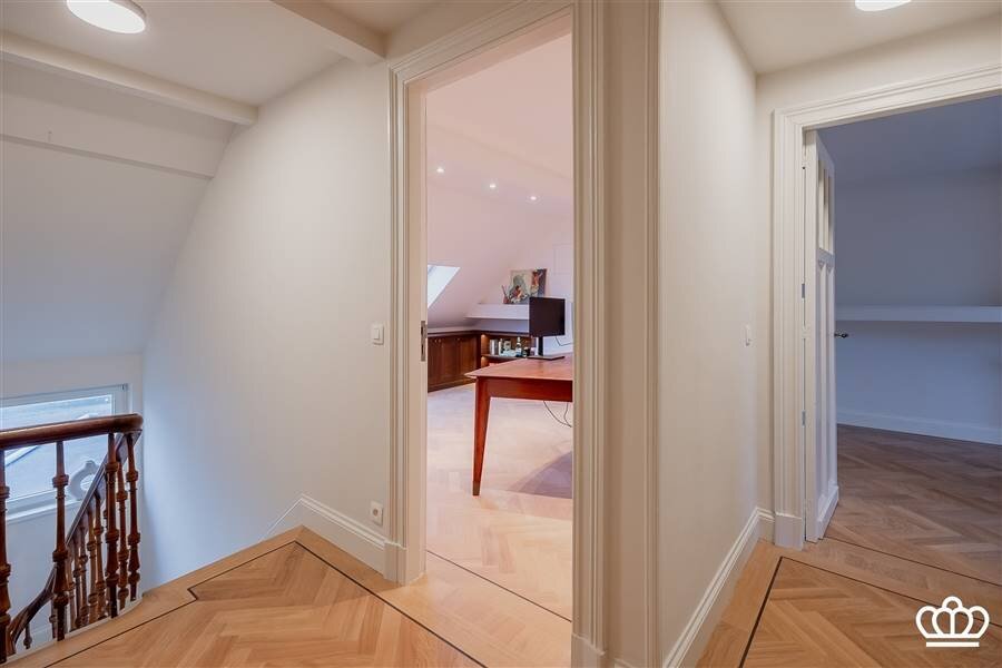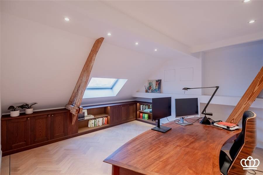 Op de derde verdieping bevindt zich een kantoorruimte op eikenhouten visgraatparket, uitgerust met een op maat gemaakt wandmeubel in walnoothout en verfijnde, geïntegreerde inbouw- en LED-verlichting.