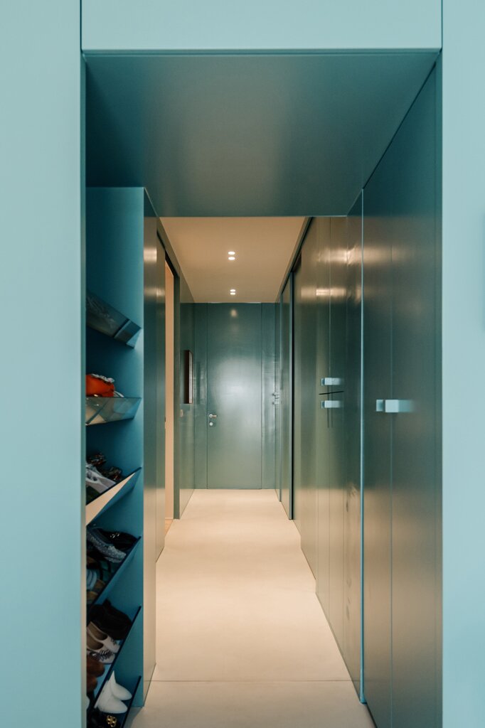The living space is bathed in light and opens seamlessly onto the south-facing terrace, a place where indoors and outdoors meet. The combination of dark wood, refined materials and bespoke furniture creates a sober yet luxurious atmosphere. The cosy fireplace is the heart of the home, perfect for cosy evenings or a moment of tranquillity with a view of the city.