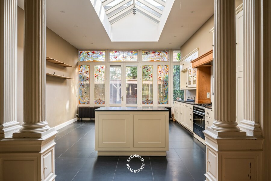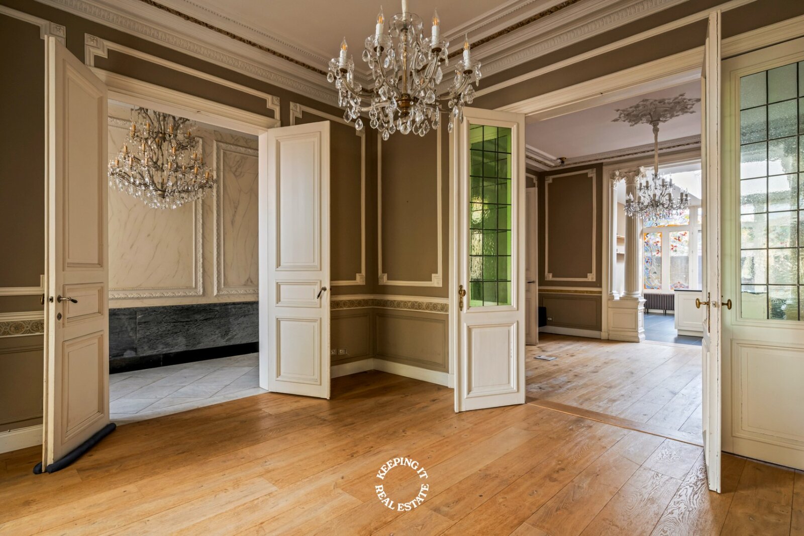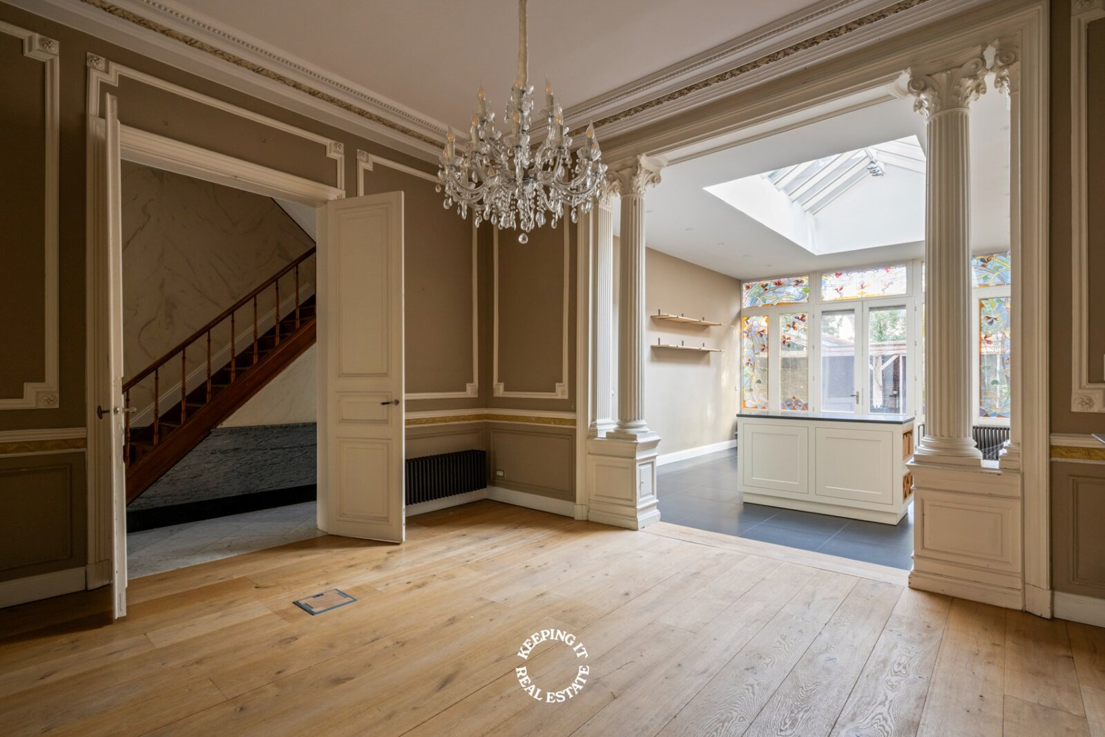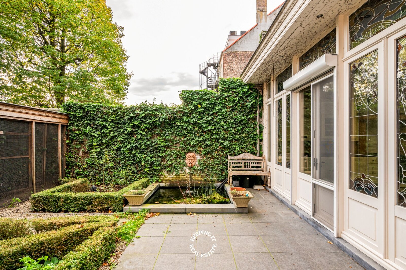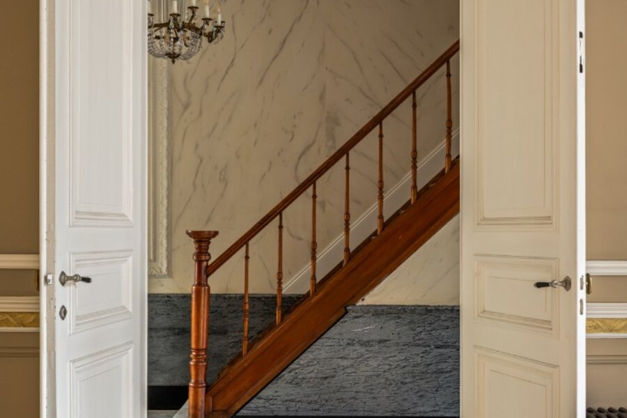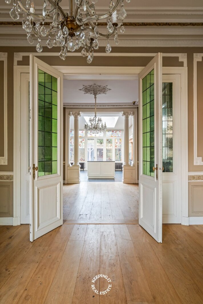 Bij het binnenkomen valt meteen het oog op de originele trap, de marmeren vloer en de elegante lambrisering, een voorbode van het verfijnde woongevoel dat doorheen de woning verdergezet wordt. De lichtrijke leefruimte met massieve parket en hoge plafonds straalt rust en klasse uit. Aansluitend bevindt zich een sfeervolle tussenruimte, die perfect als tweede salon kan dienen, die uitmondt in volledig ingerichte keuken met eethoek. Deze opent op het terras en de charmante stadstuin, waar privacy en gezelligheid centraal staan.