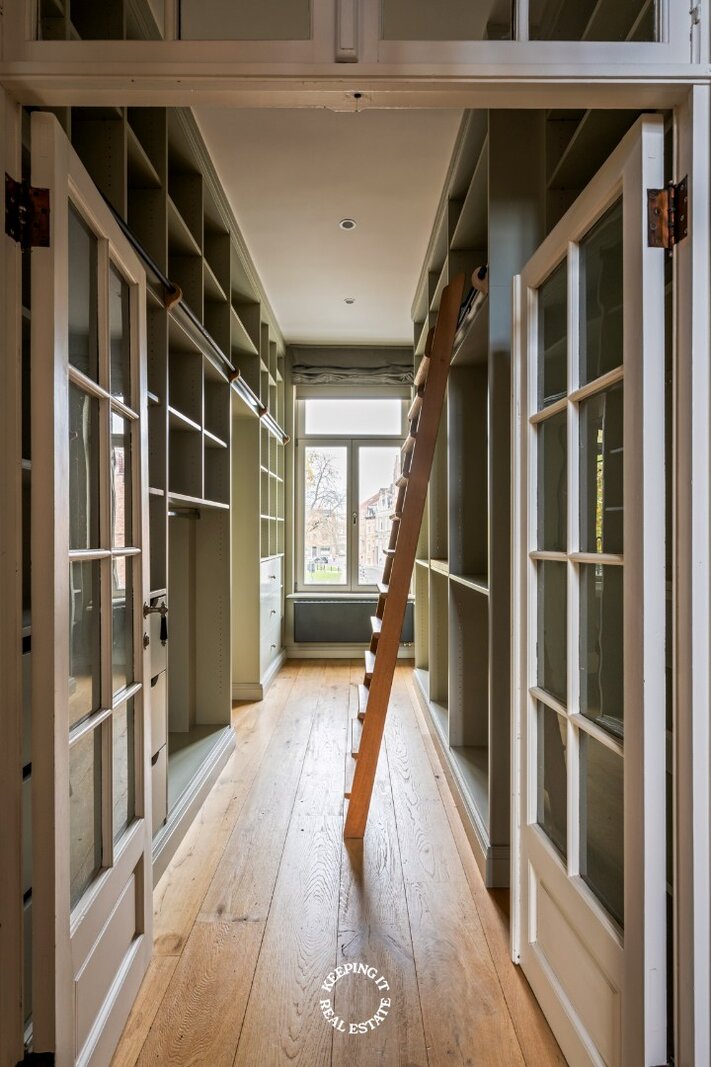 De eerste verdieping treft men de master suite met ruime dressing en aansluitende badkamer, voorzien van inloopdouche, ligbad en dubbele wastafel. Een zonnig terras biedt hier een mooi verlengde van de slaapkamer. Op de bovenliggende verdiepingen bevinden zich drie volwaardige slaapkamers, elk met eigen badkamer, en een aparte slaapkamer met mezzanine, ideaal als gastenkamer of atelier.