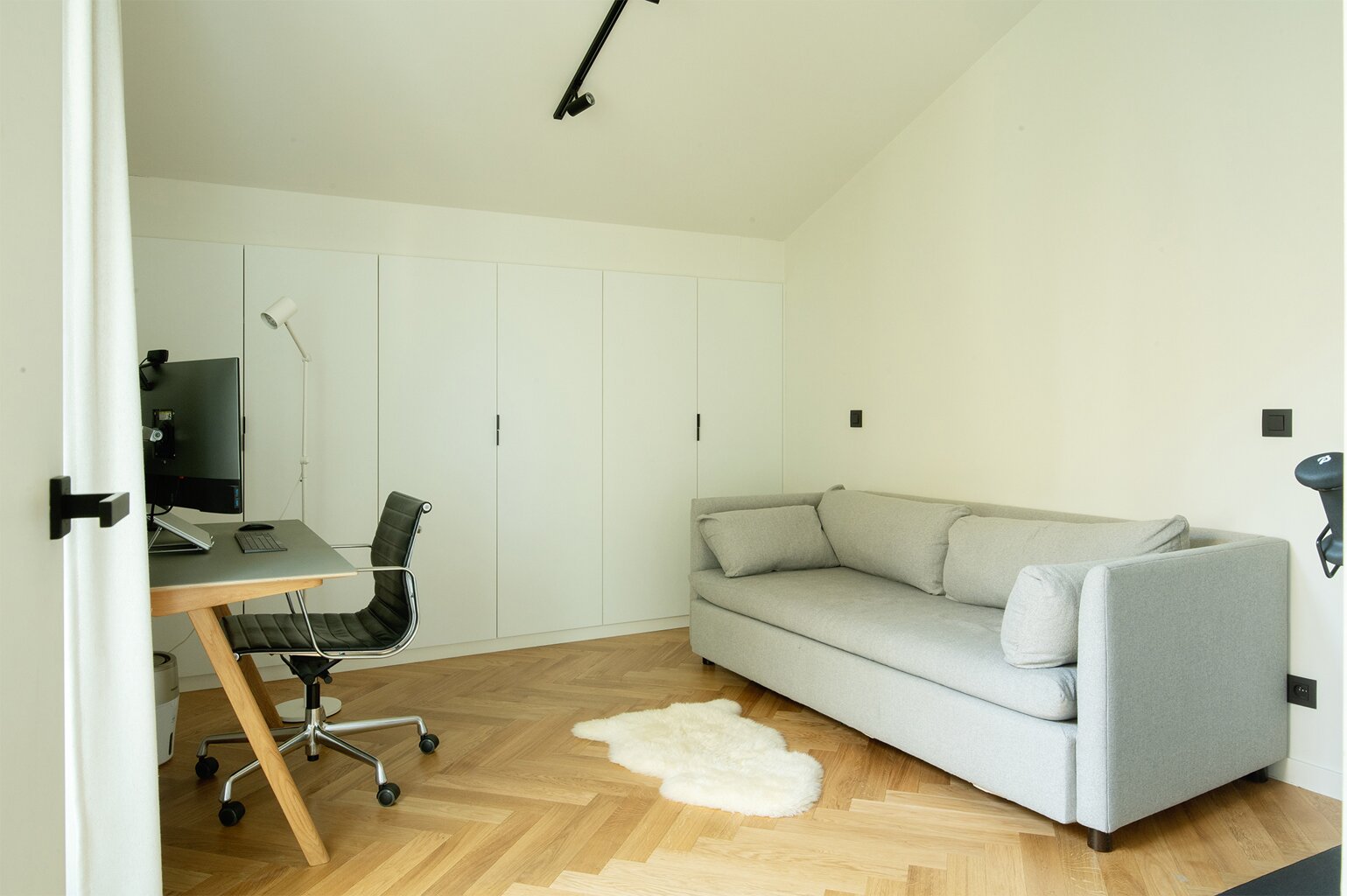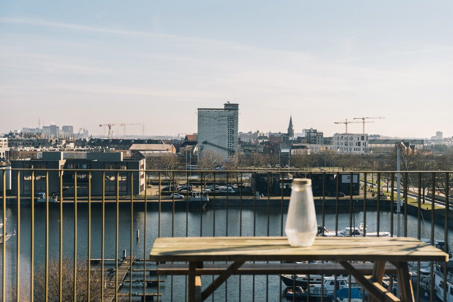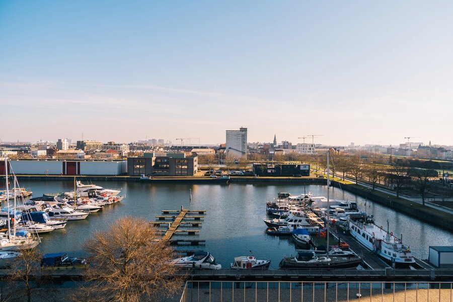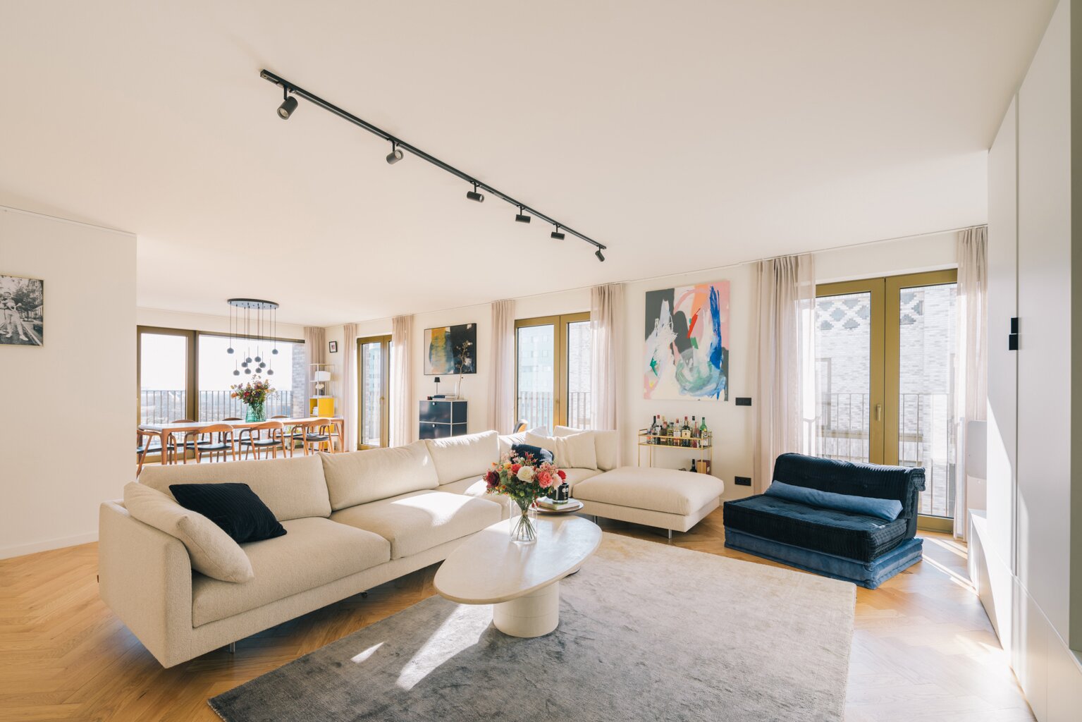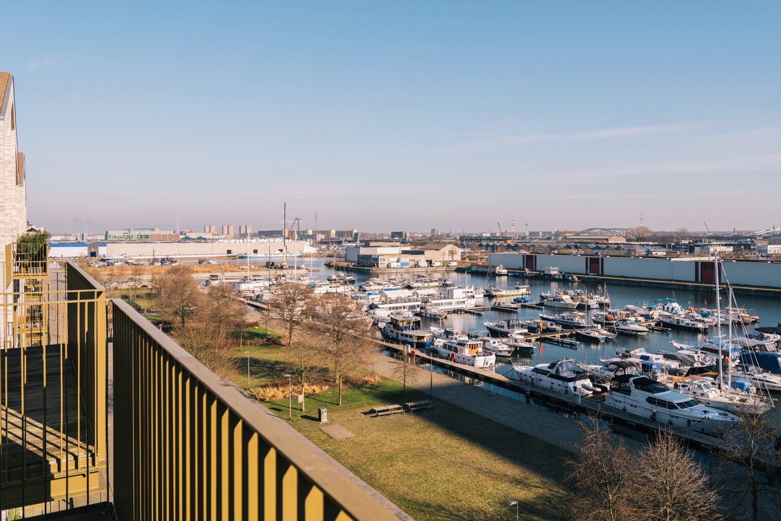 Luxury penthouse on the 5th and 6th floors of a stunning new building with energy label A, solar panels, underground parking garage, bike storage, air conditioning, and an architectural nod to the maritime history of the neighborhood. The 5th and 6th floors are connected by both stairs and an elevator, making the apartment ideal for residents of all ages. The entrance hall features built-in wardrobes, a cloakroom, and guest toilet. Next is the integrated open living area, where the sun-drenched kitchen seamlessly flows into the dining area and the oversized lounge, offering panoramic views over the Kempisch dok and 3 delightful terraces. Throughout the penthouse, high-quality materials are used (fior di bosco marble, parquet, oak, etc.). Convenient, spacious laundry room.