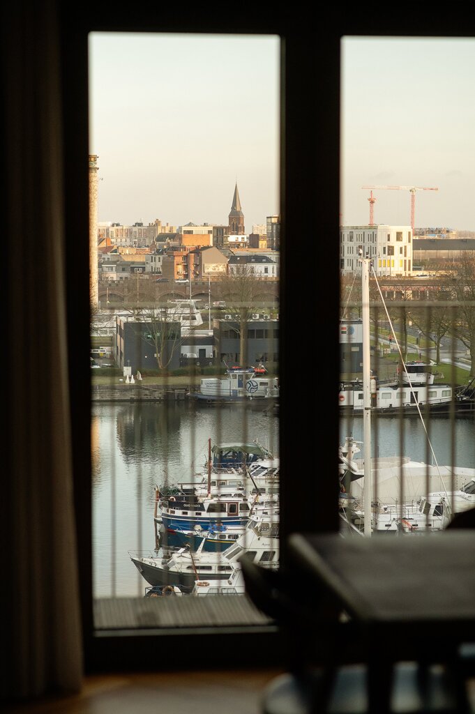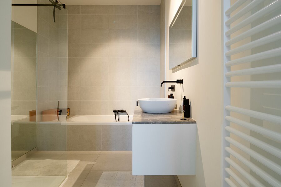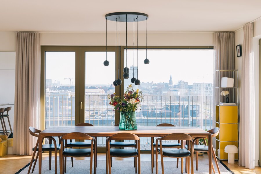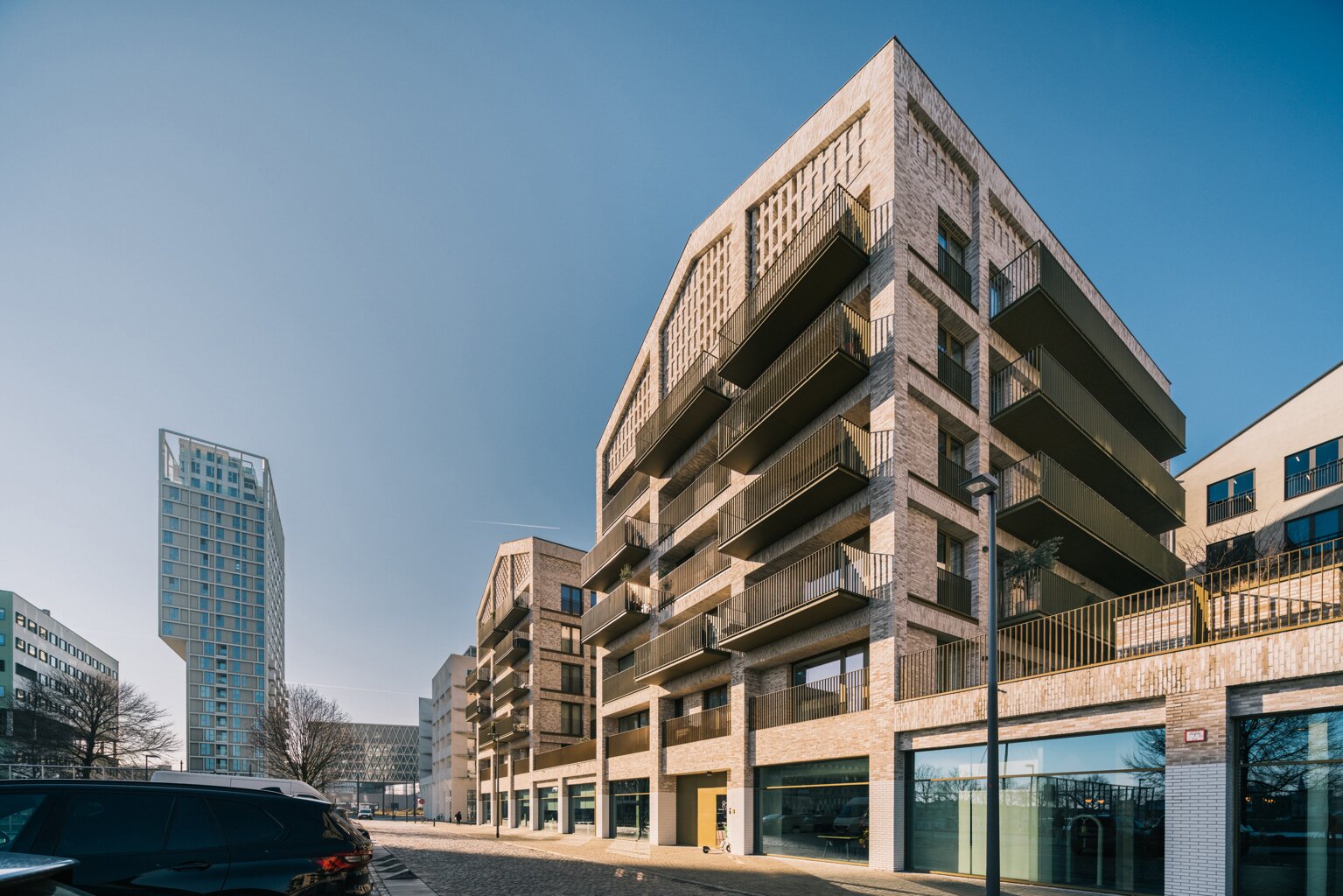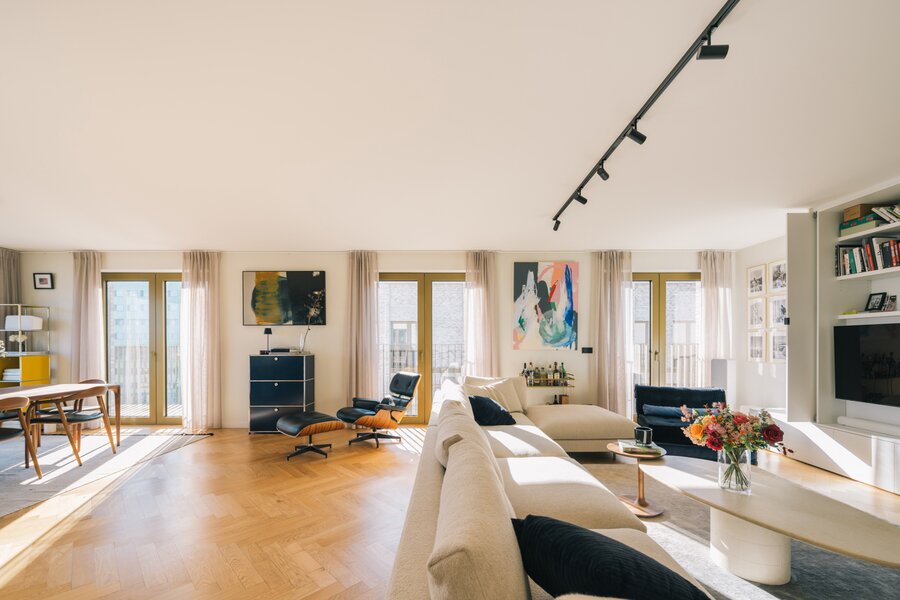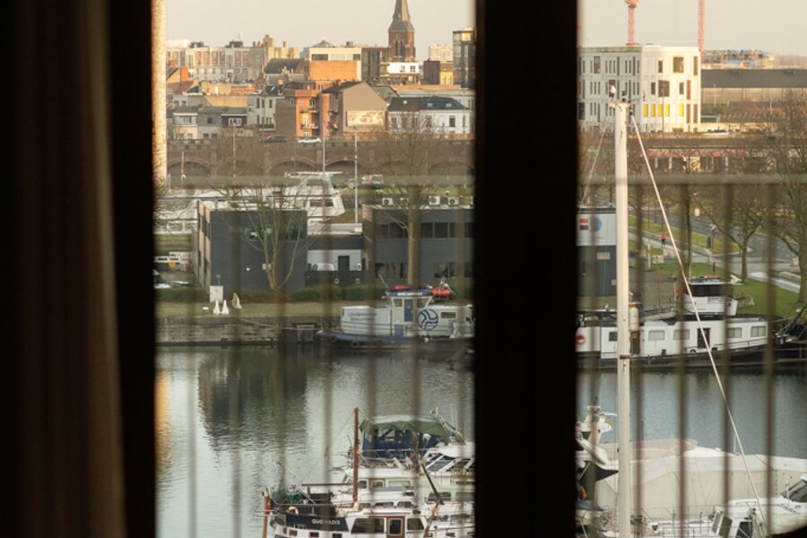 Luxury penthouse on the 5th and 6th floors of a stunning new building with energy label A, solar panels, underground parking garage, bike storage, air conditioning, and an architectural nod to the maritime history of the neighborhood. The 5th and 6th floors are connected by both stairs and an elevator, making the apartment ideal for residents of all ages. The entrance hall features built-in wardrobes, a cloakroom, and guest toilet. Next is the integrated open living area, where the sun-drenched kitchen seamlessly flows into the dining area and the oversized lounge, offering panoramic views over the Kempisch dok and 3 delightful terraces. Throughout the penthouse, high-quality materials are used (fior di bosco marble, parquet, oak, etc.). Convenient, spacious laundry room.