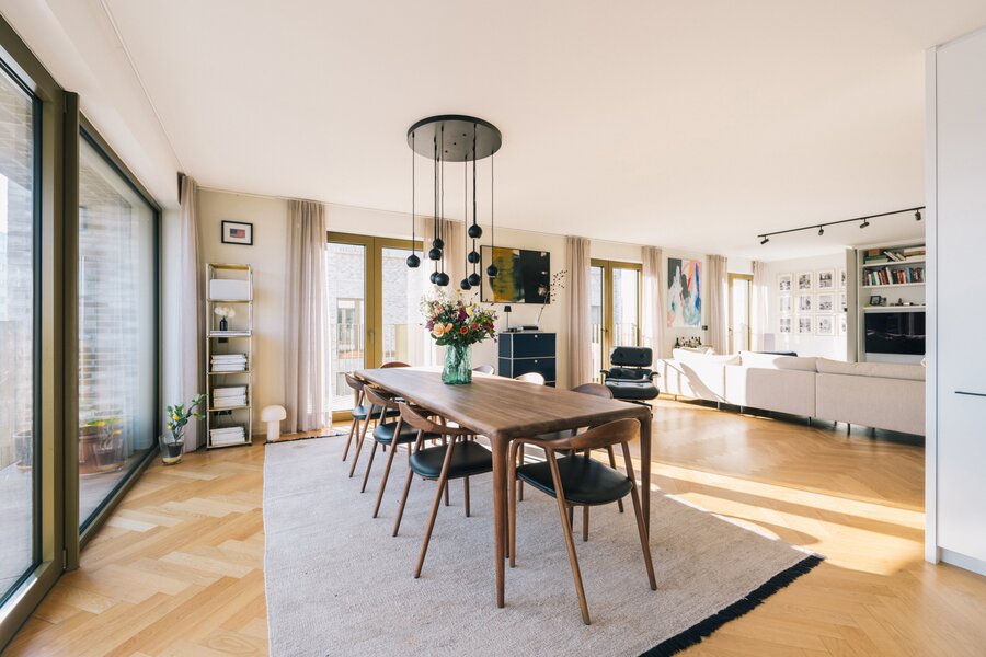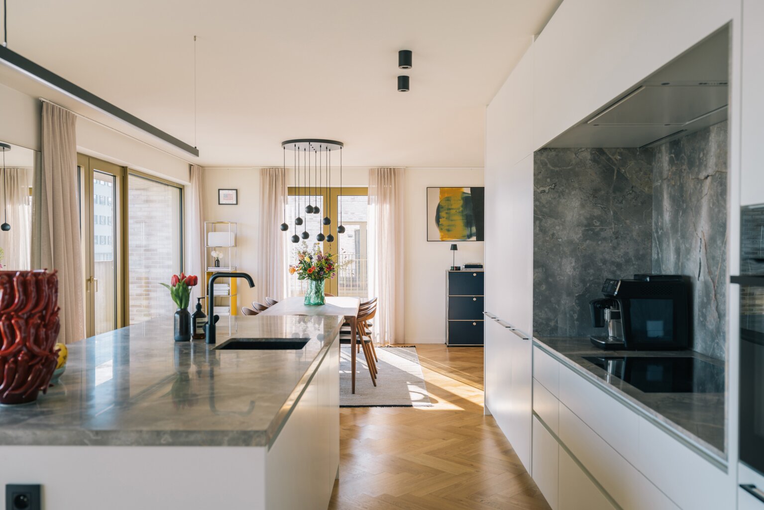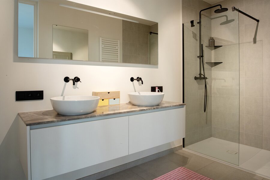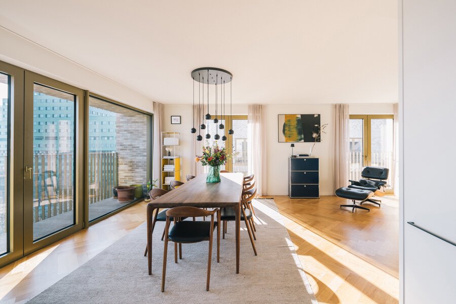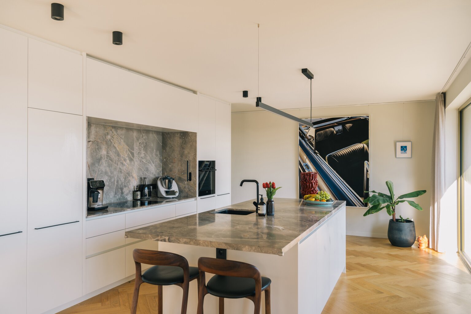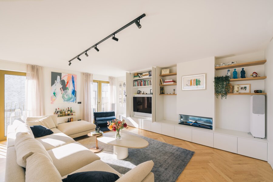 Luxury penthouse on the 5th and 6th floors of a stunning new building with energy label A, solar panels, underground parking garage, bike storage, air conditioning, and an architectural nod to the maritime history of the neighborhood. The 5th and 6th floors are connected by both stairs and an elevator, making the apartment ideal for residents of all ages. The entrance hall features built-in wardrobes, a cloakroom, and guest toilet. Next is the integrated open living area, where the sun-drenched kitchen seamlessly flows into the dining area and the oversized lounge, offering panoramic views over the Kempisch dok and 3 delightful terraces. Throughout the penthouse, high-quality materials are used (fior di bosco marble, parquet, oak, etc.). Convenient, spacious laundry room.