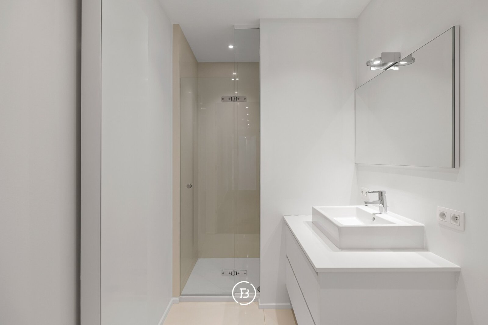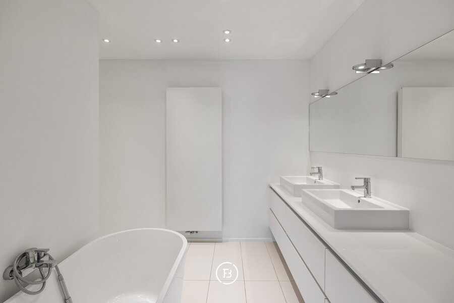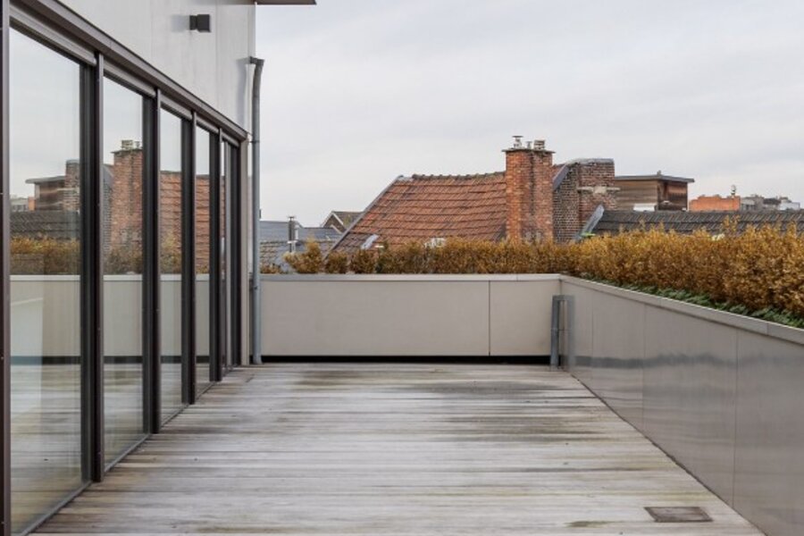 Buiten vormt het 50 m² grote terras een echte meerwaarde: een stille, private buitenruimte die het interieur verlengt, met verzicht.