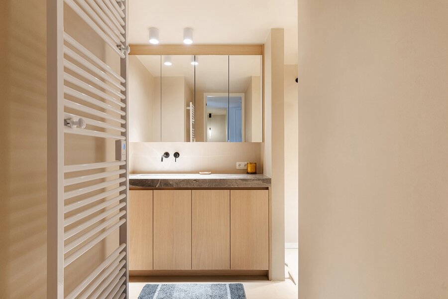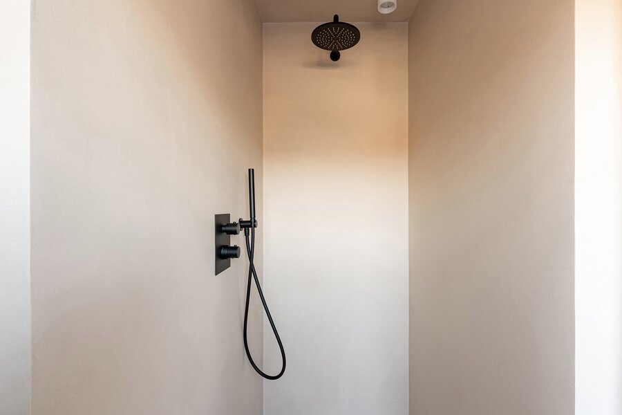 On the upper floor are three comfortable bedrooms. The master bedroom has an en-suite bathroom with bathtub, large walk-in shower, and sink. The two other bedrooms, each suitable for a double bed, share a second bathroom with walk-in shower. A separate toilet is also present on this floor. All bedrooms feature built-in closets.