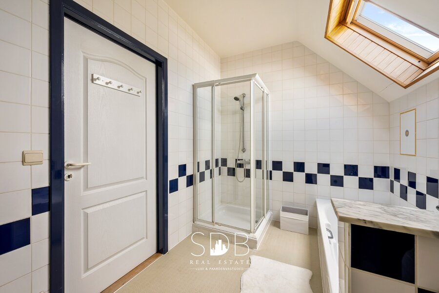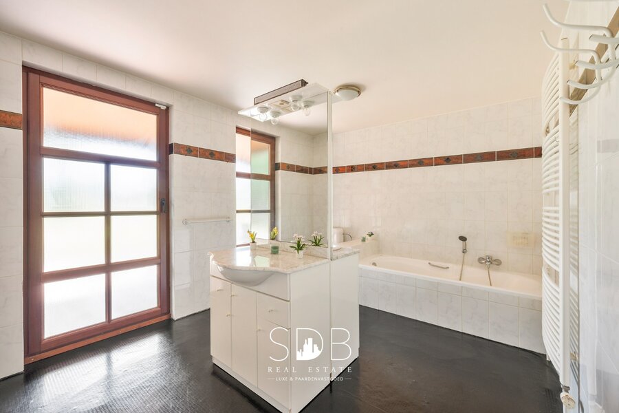 Een 2de badkamer is eveneens voorzien van een enkel lavabomeubel, een douche en een ligbad.