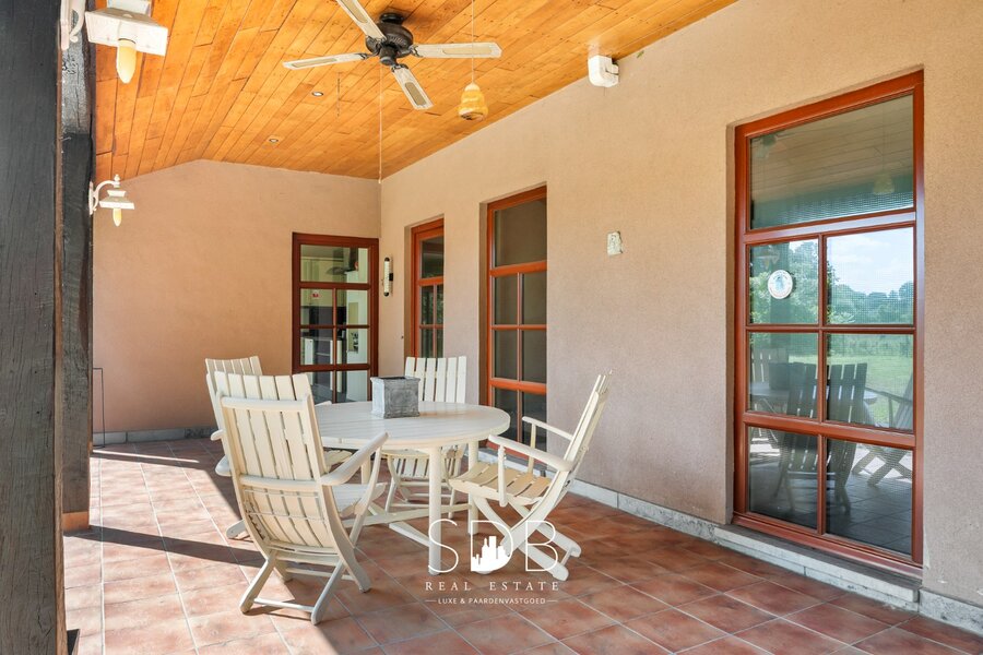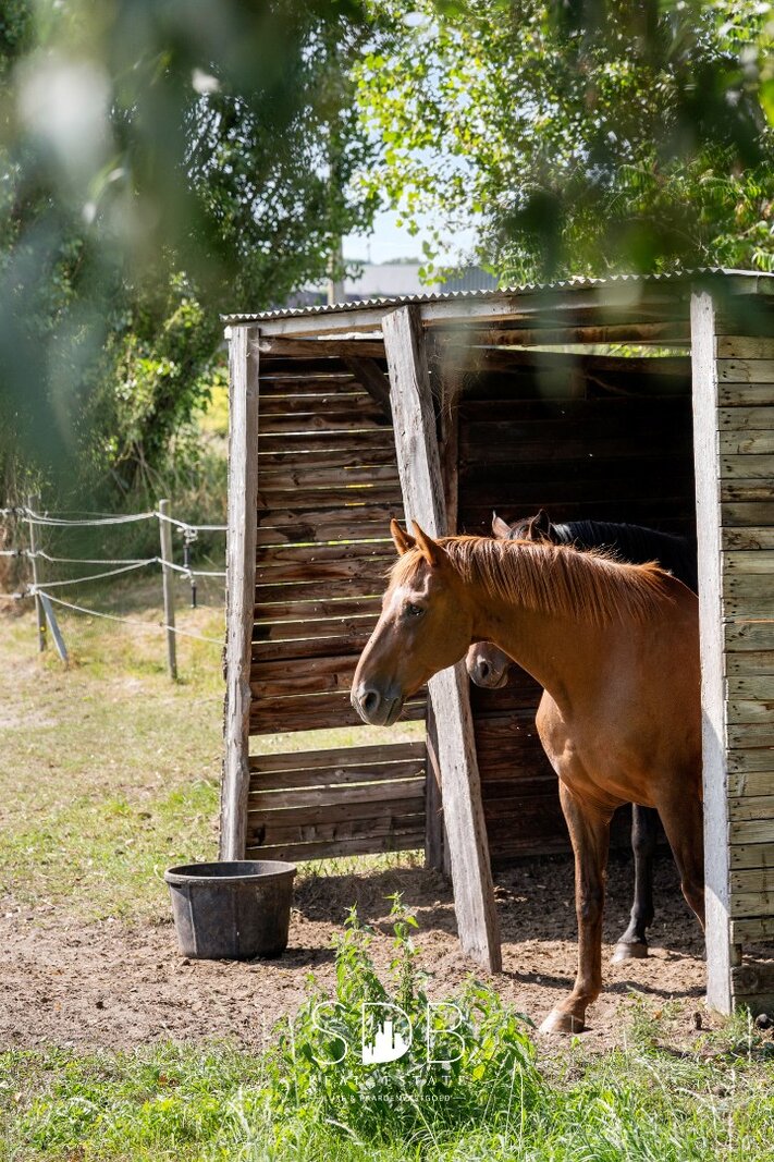 Buitenshuis treffen we de gezinstuin aan met omliggend groen en omheinde graslanden, ingericht met een inloopstal voor het huisvesten van dieren en/of paarden.