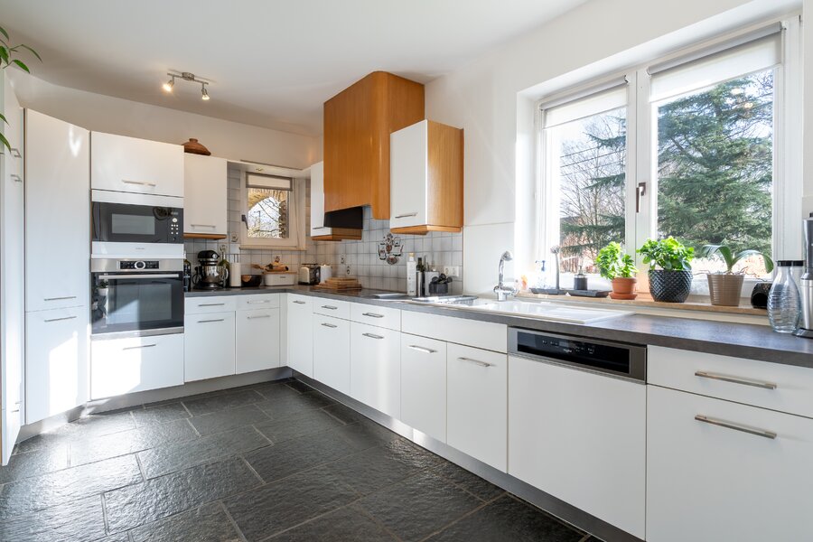 The living areas open onto large terraces at the front and back, perfect for enjoying the tree-lined garden, which also features a heated pool with a sliding cover.