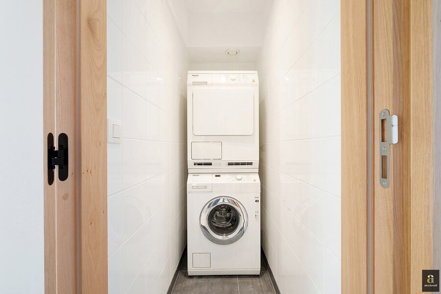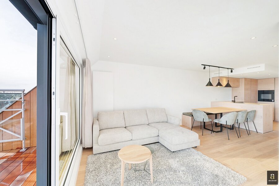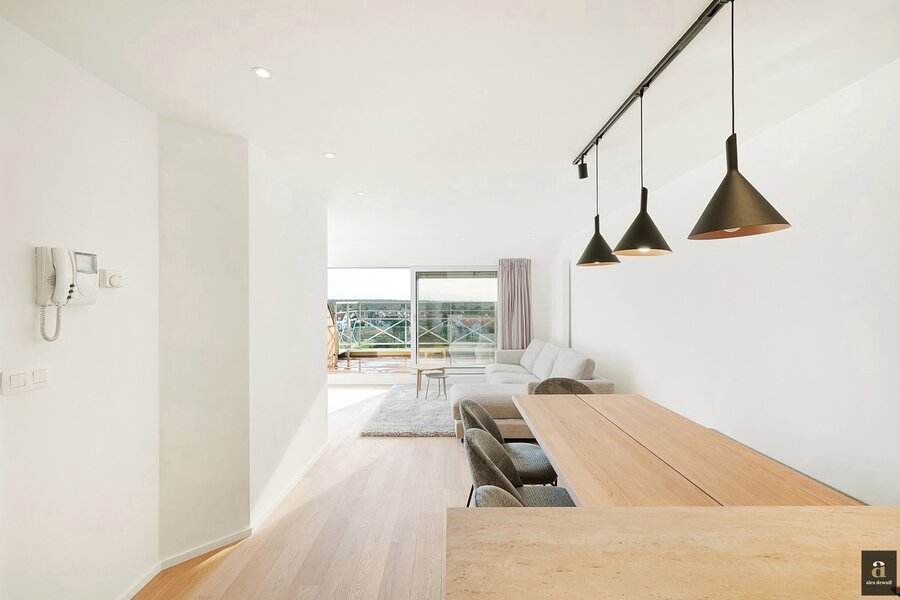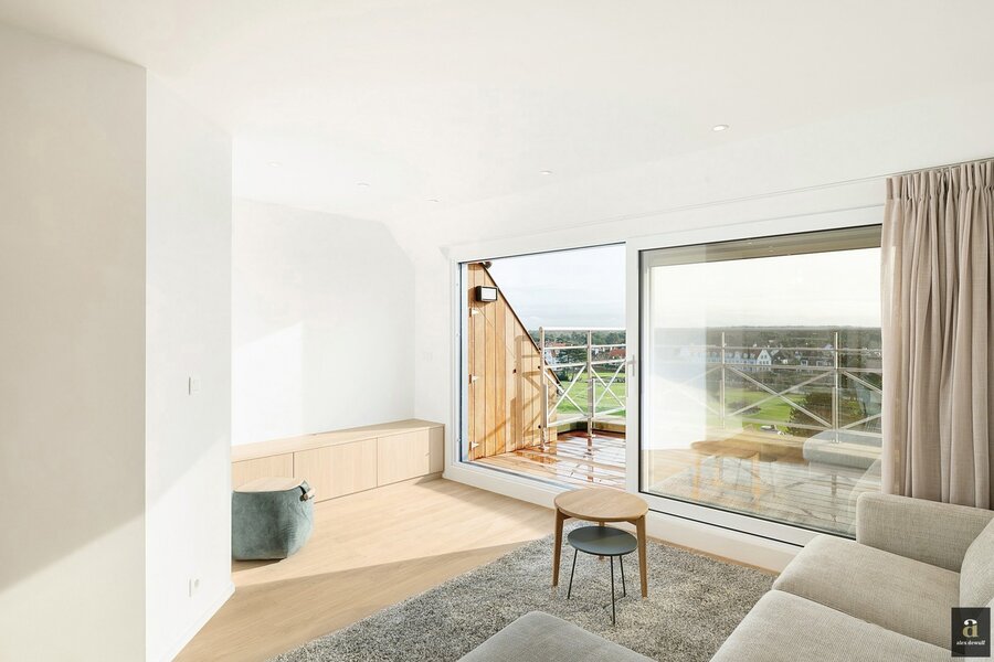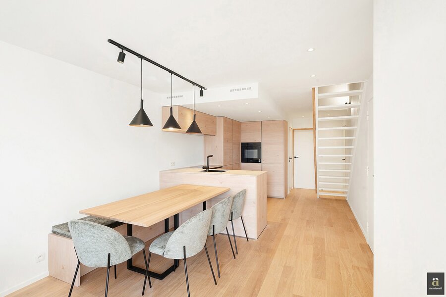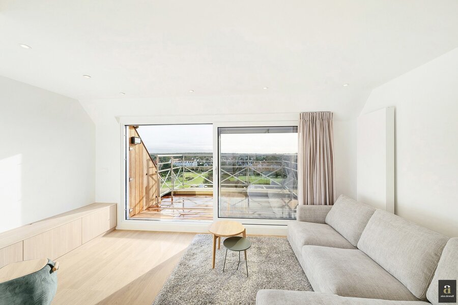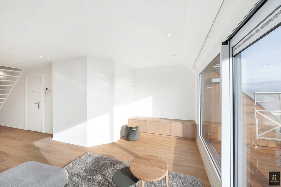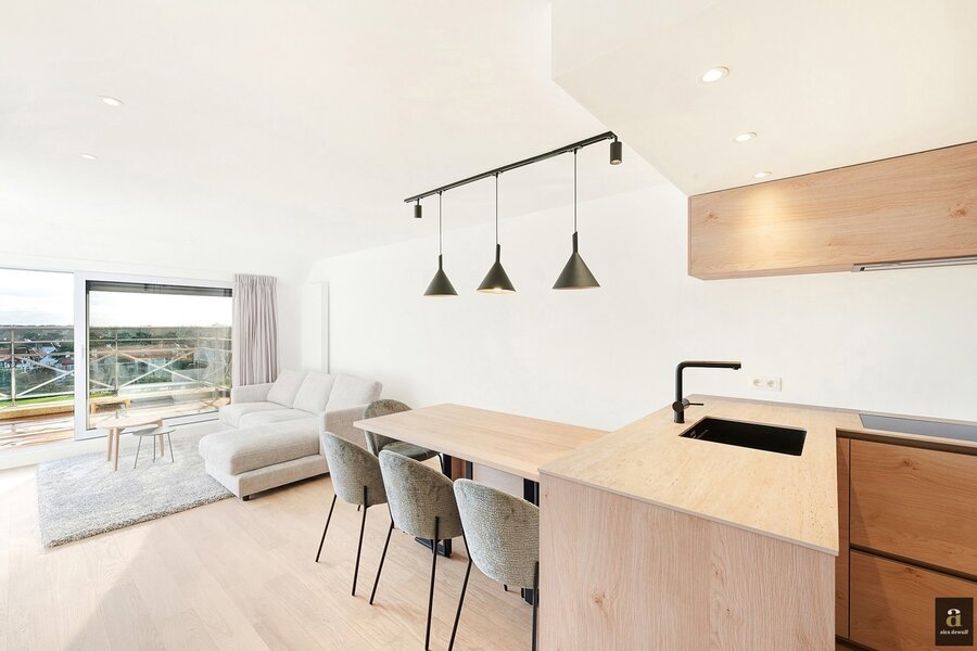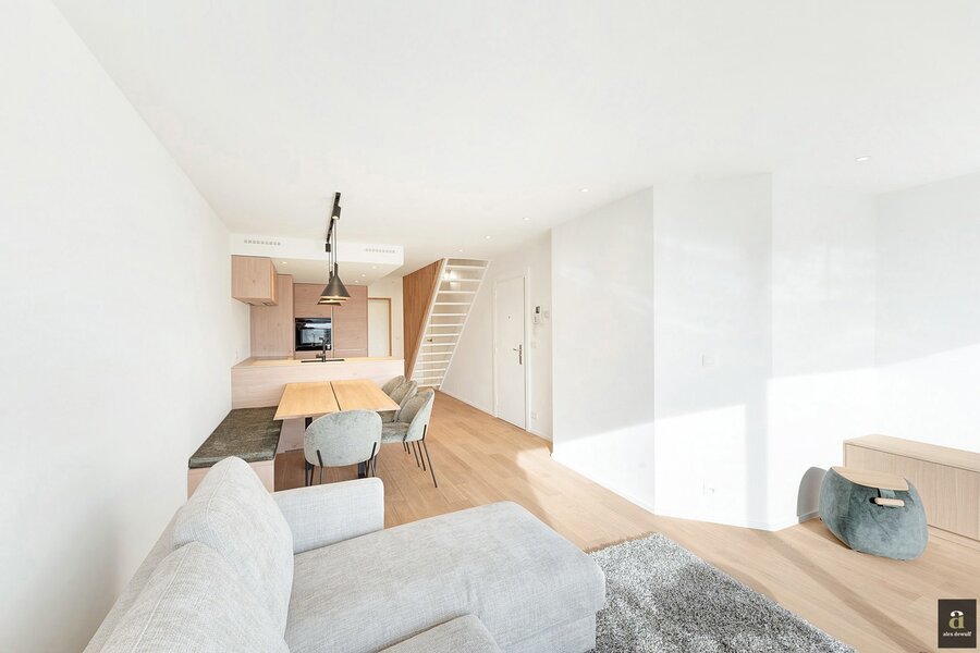 This beautifully renovated penthouse is located on the prestigious Kustlaan and combines luxurious living comfort with breathtaking views over Het Zoute. Upon entering, the eye is immediately drawn to the bright living area, where a fully equipped open-plan kitchen seamlessly connects to the lounge. The kitchen features a dishwasher, a combi oven and a spacious fridge with freezer compartment.
