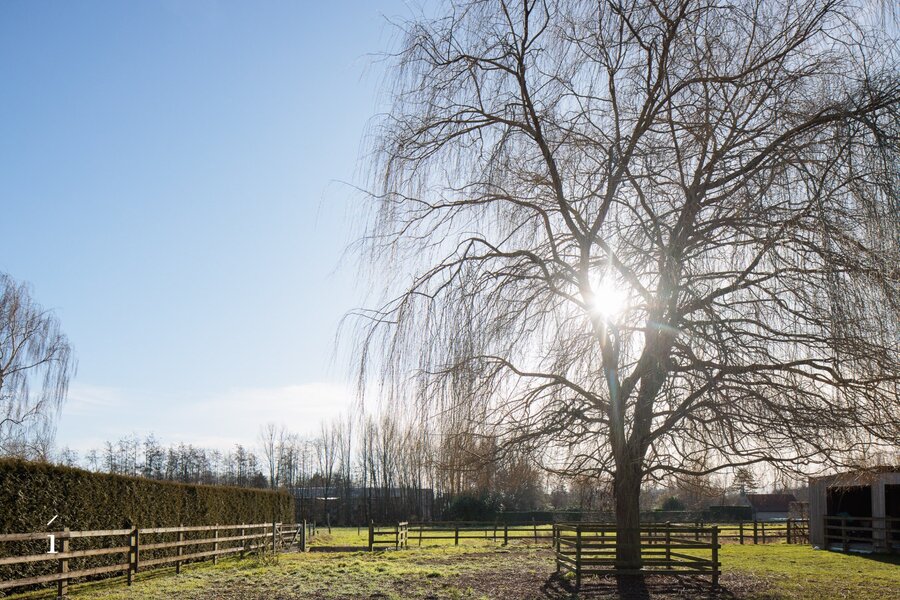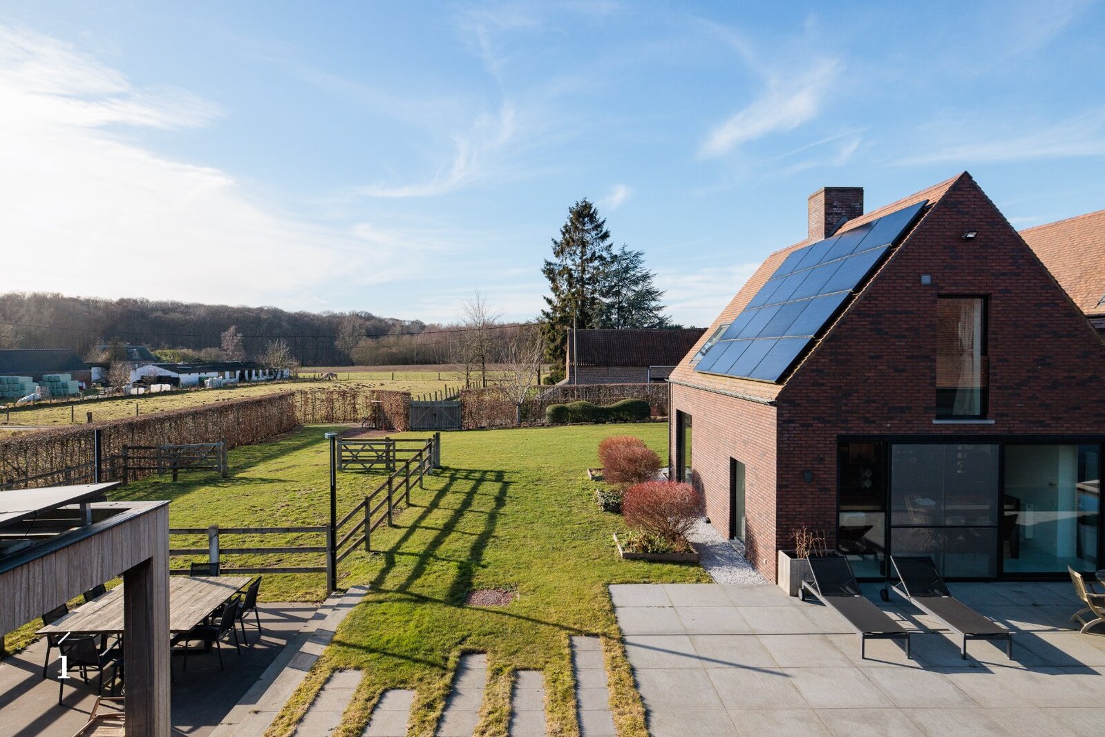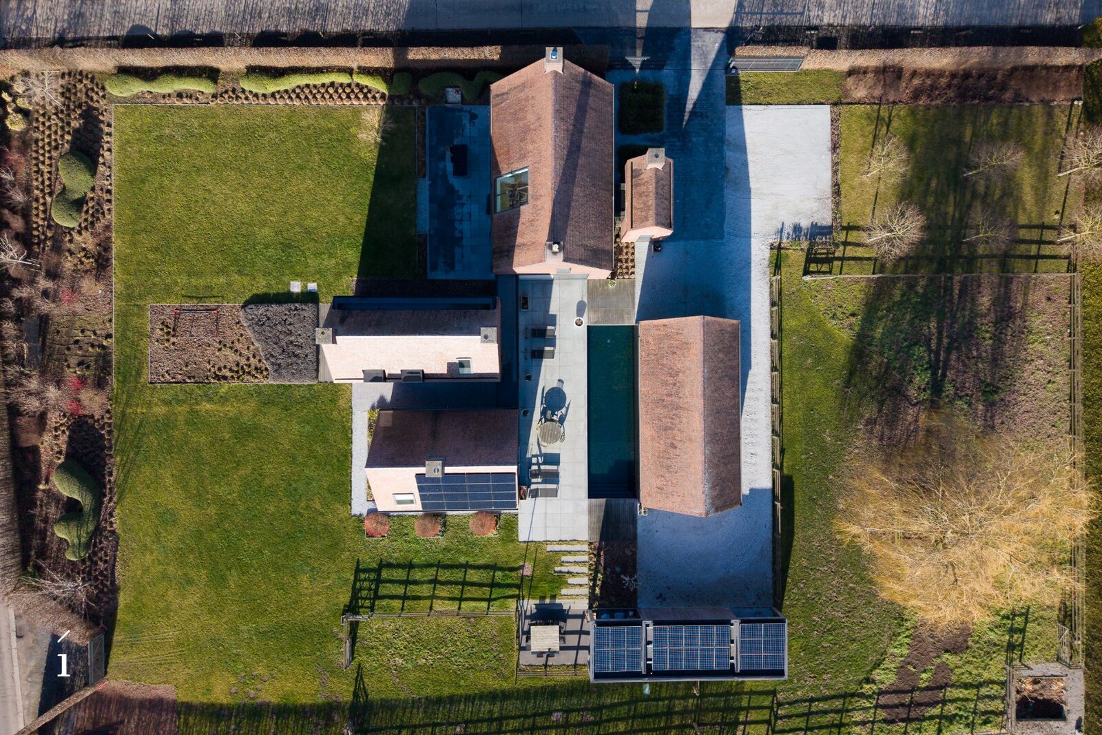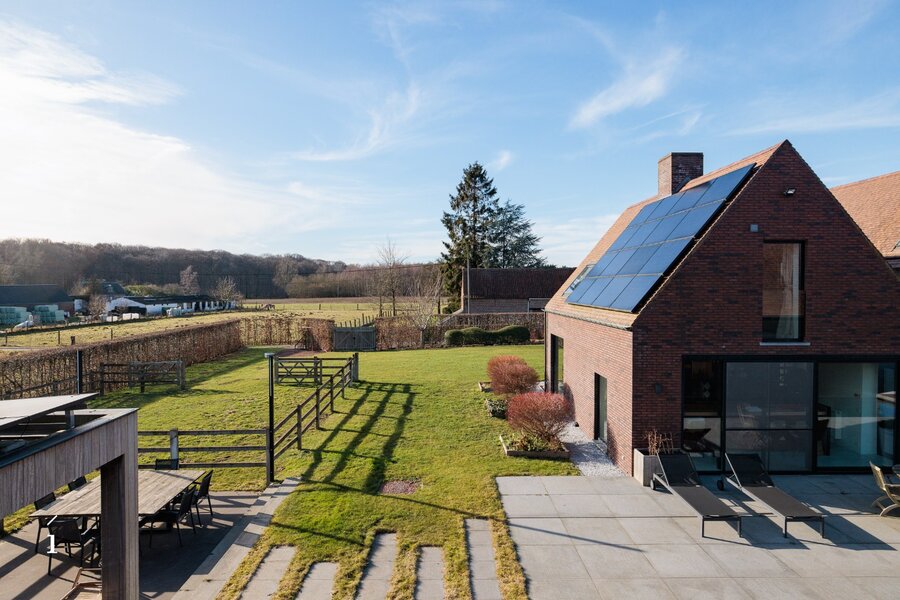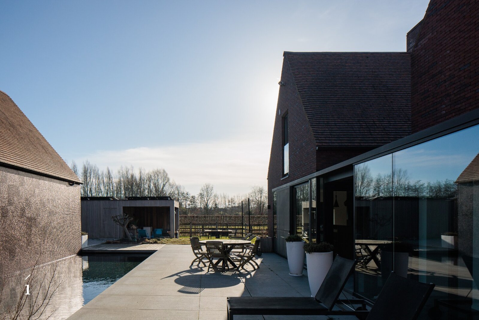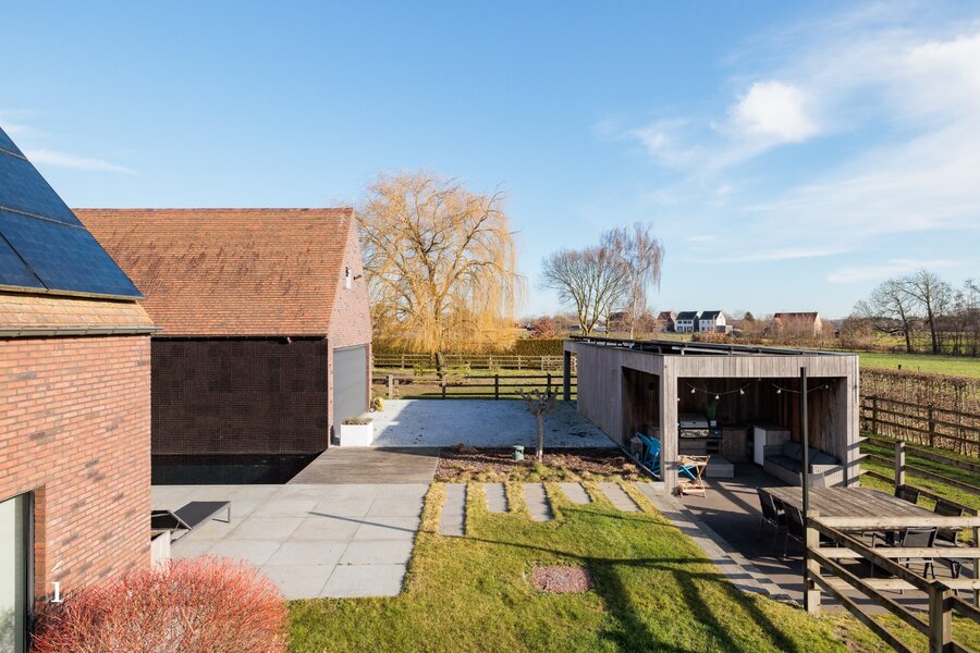 Rond de moderne vierkantshoeve ontvouwt zich een fraai aangelegde tuin die uitnodigt tot rust en verfijnd buitenleven. Ingetogen luxe vertaalt zich in natuurlijke materialen, doordachte zichtlijnen en harmonieuze overgangen tussen binnen en buiten.
