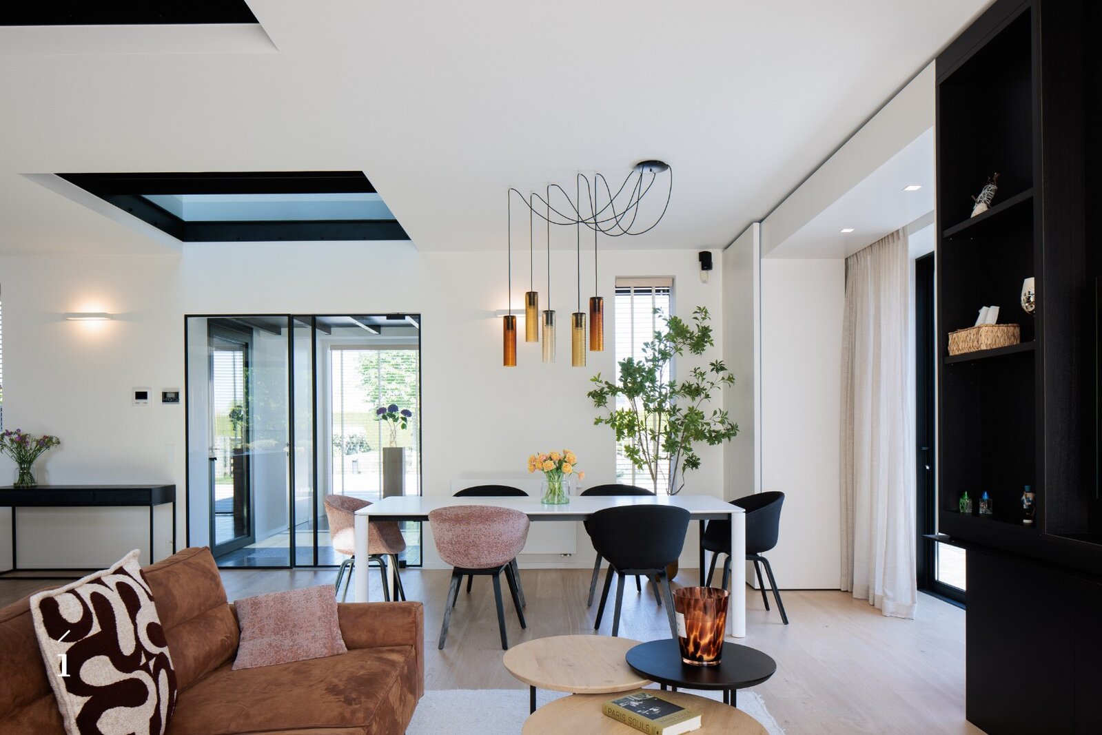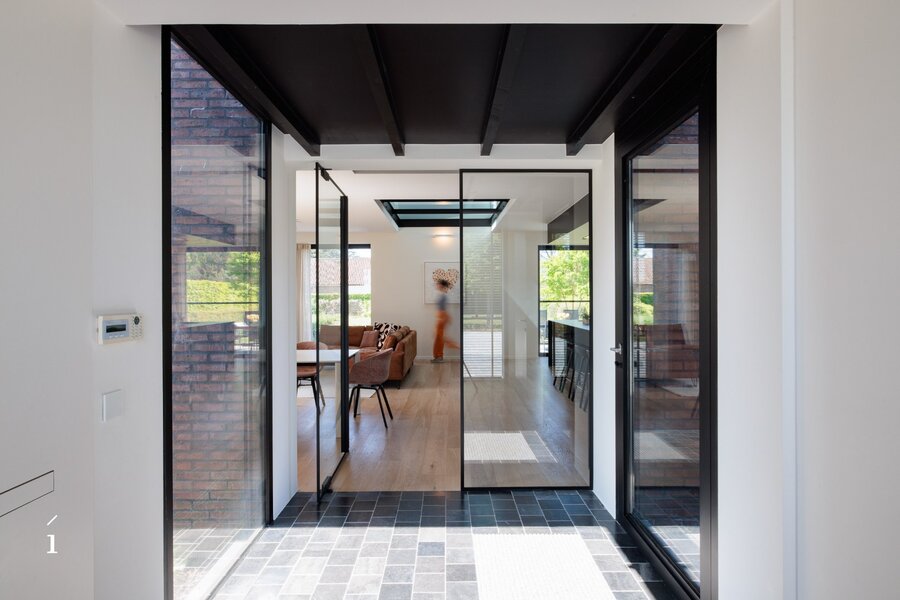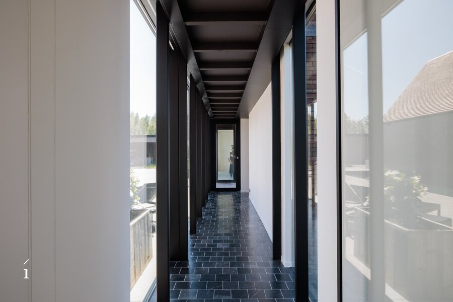 Via een glazen verbindingshal bereikt men de tweede vleugel van het hoofdgebouw, waar grote raampartijen zorgen voor een open gevoel en mooie zichten op de tuin.