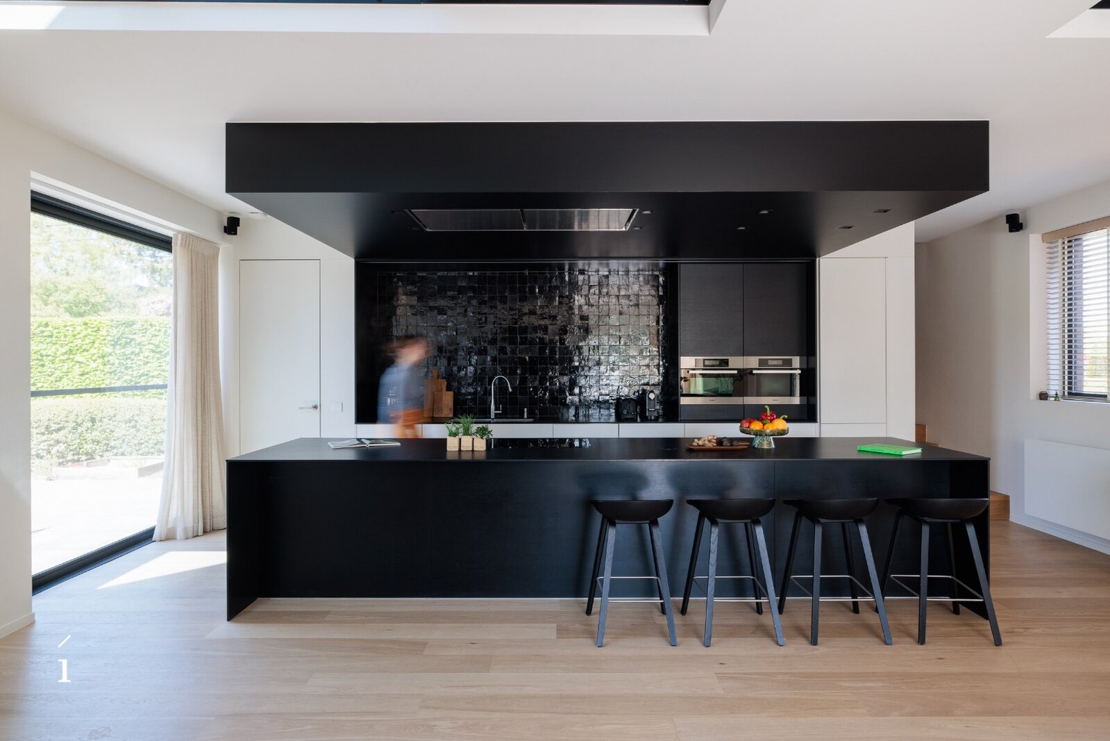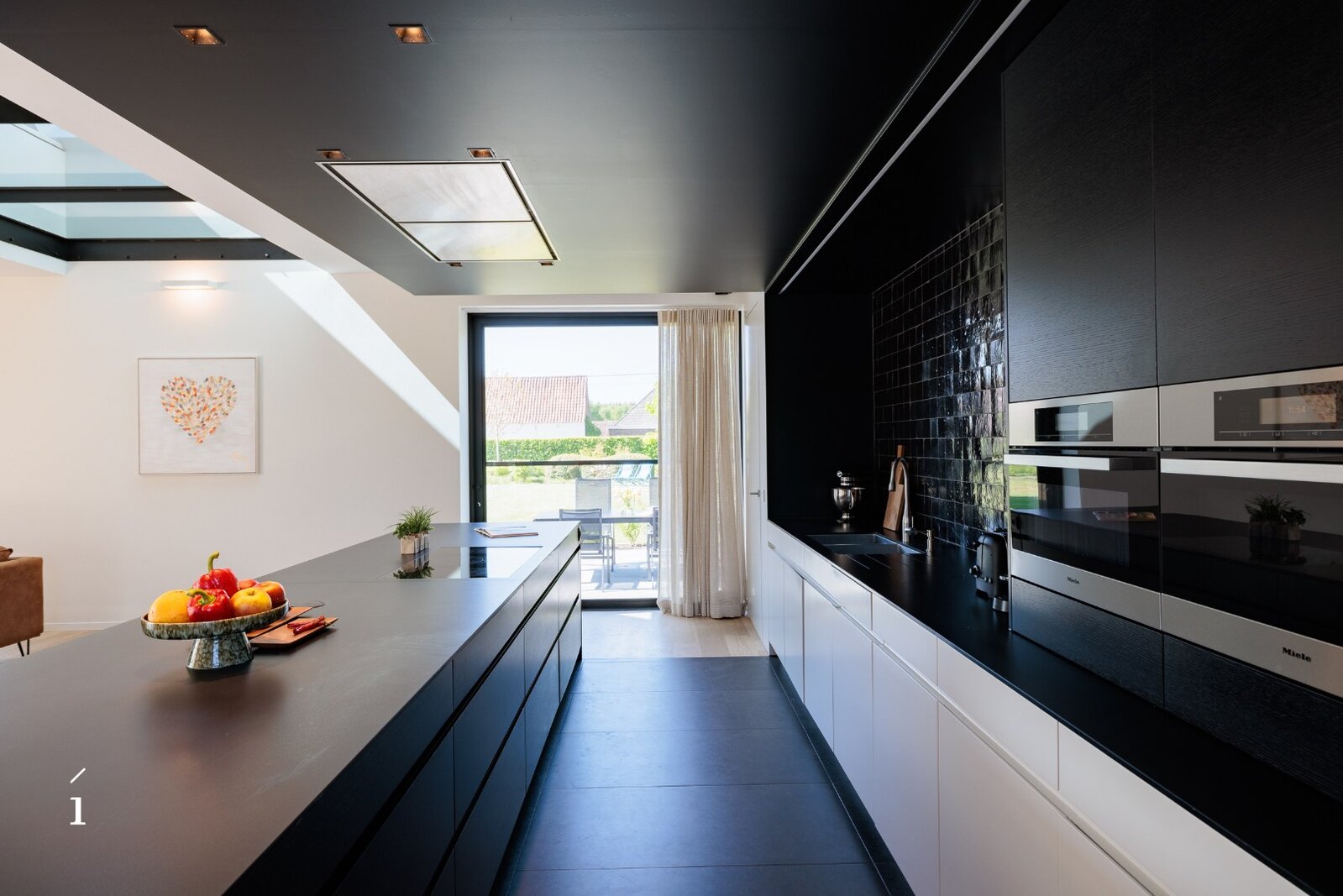 Aansluitend aan de keuken bevindt zich een praktische bijkeuken met wasplaats en technieken. De inkomhal met glazen wanden en deuren, gastentoilet en ingewerkte vestiairekasten vormt een uitnodigend en stijlvol onthaal.