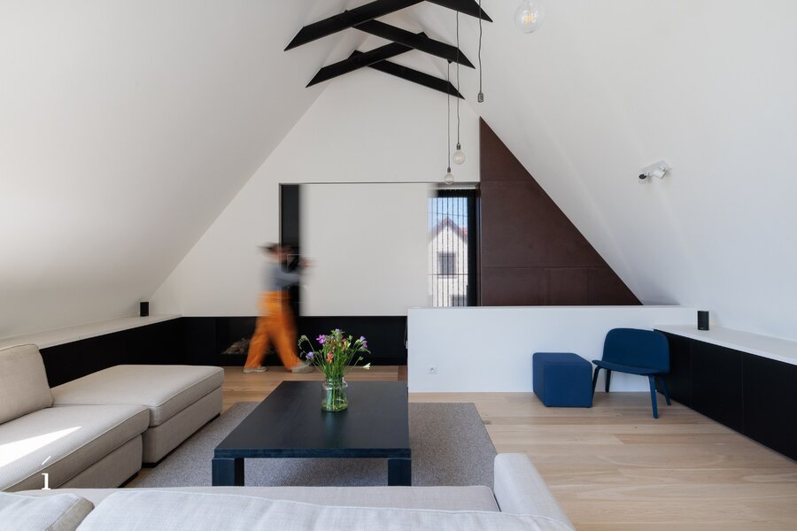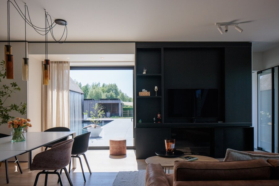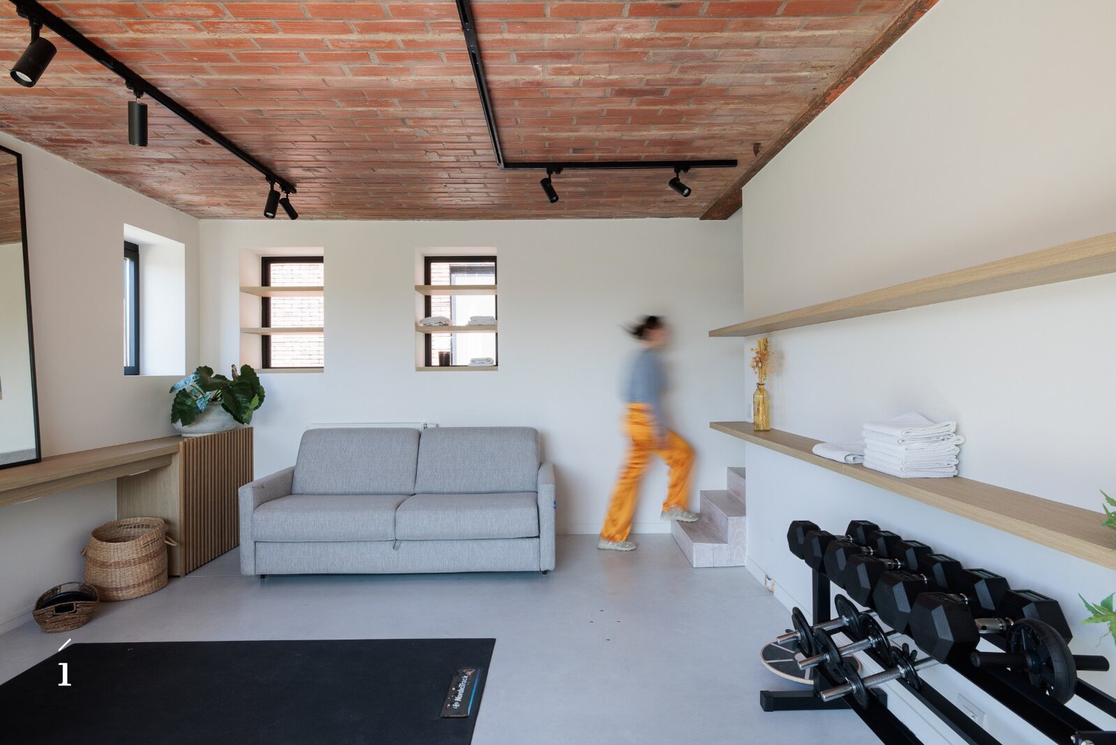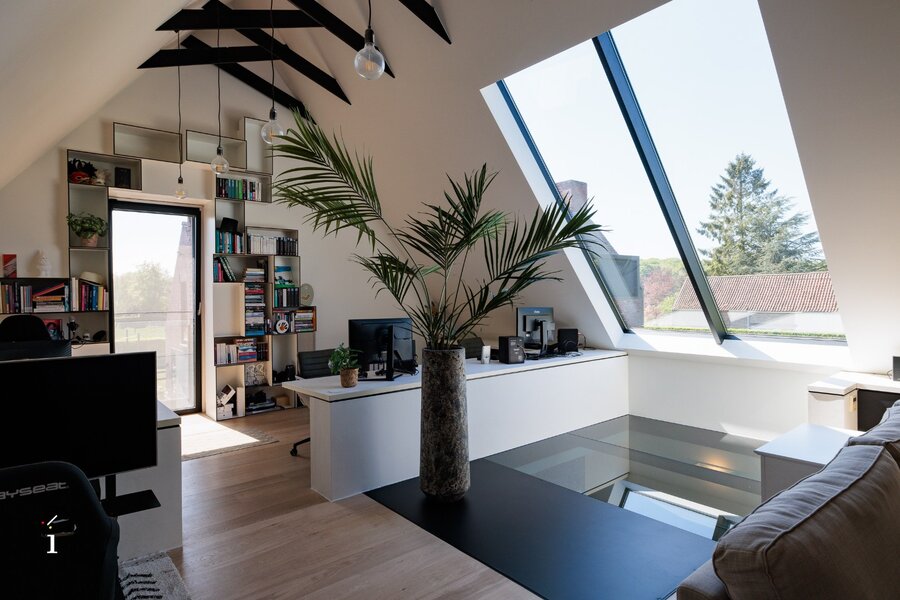 Het hoofdgebouw wordt gekenmerkt door een open leefconcept waarin leefruimte, eetplaats en keuken harmonieus in elkaar overvloeien. Hoge plafonds, royale glaspartijen en een glazen vloer zorgen voor een aangename lichtinval en een uitzonderlijk gevoel van ruimte. Onder het dak bevindt zich een open polyvalente verdieping, vandaag ingericht als bureauruimte met salon, die zich moeiteloos laat aanpassen aan uiteenlopende woonwensen.