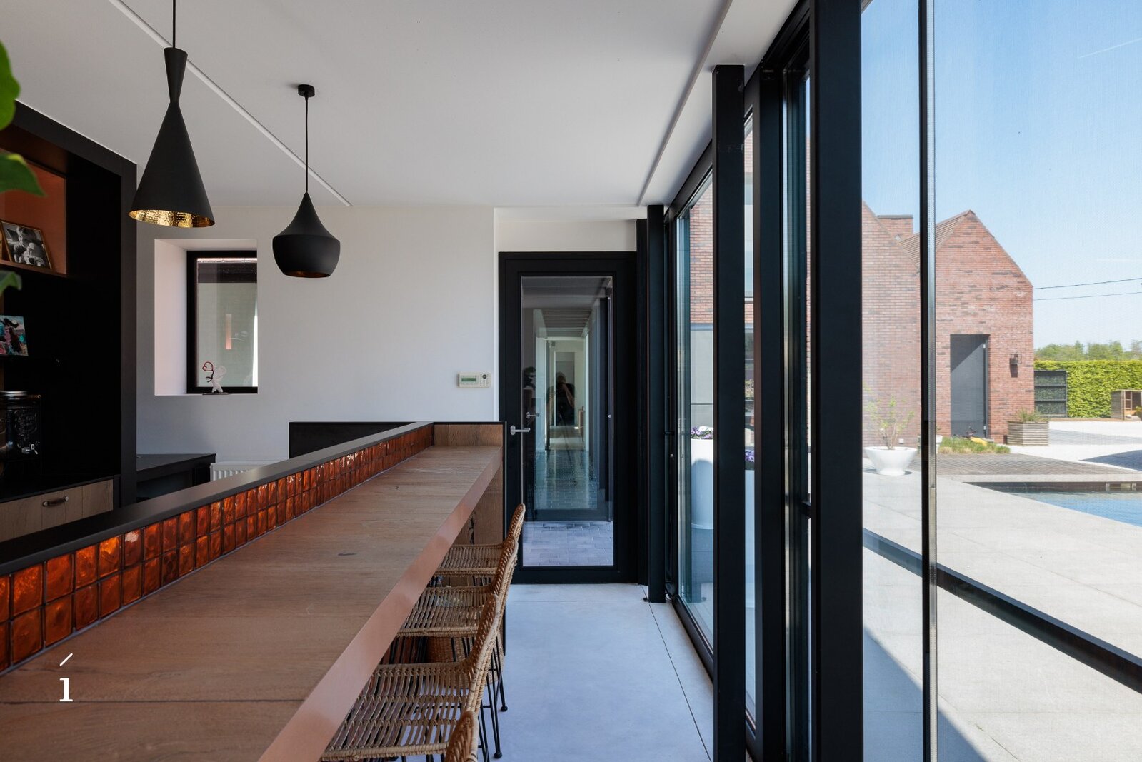Via de glazen hal bereikt men het bijgebouw, waar ontspanning en gastvrijheid centraal staan. De bar sluit via grote schuiframen naadloos aan op het centrale terras en het zwembad.