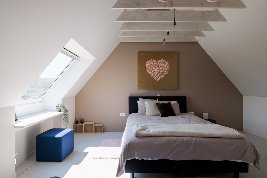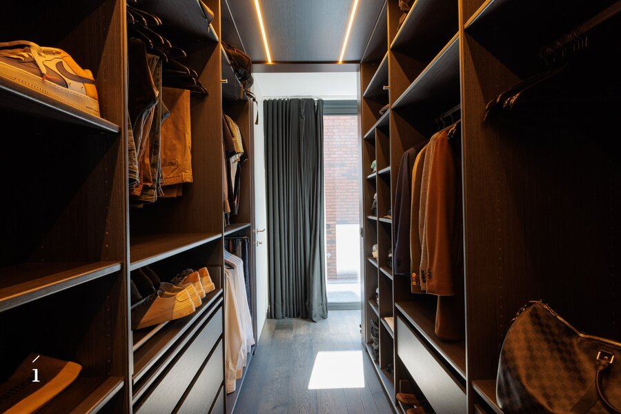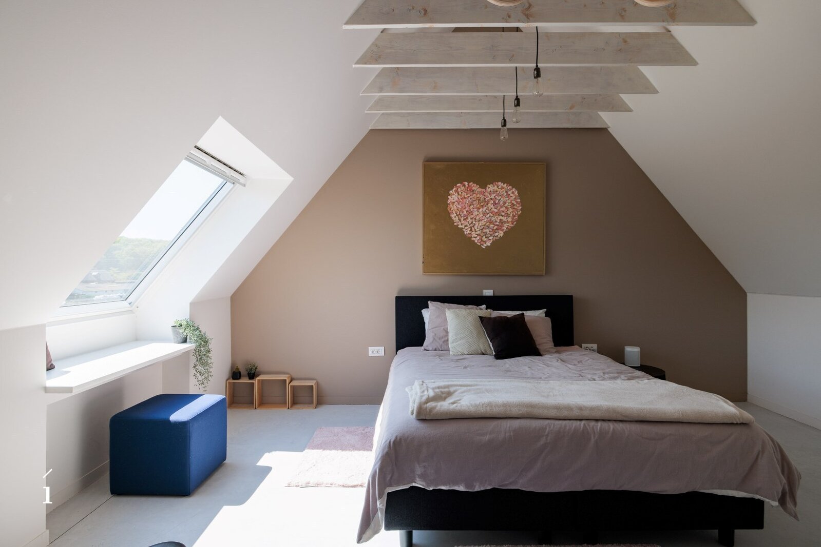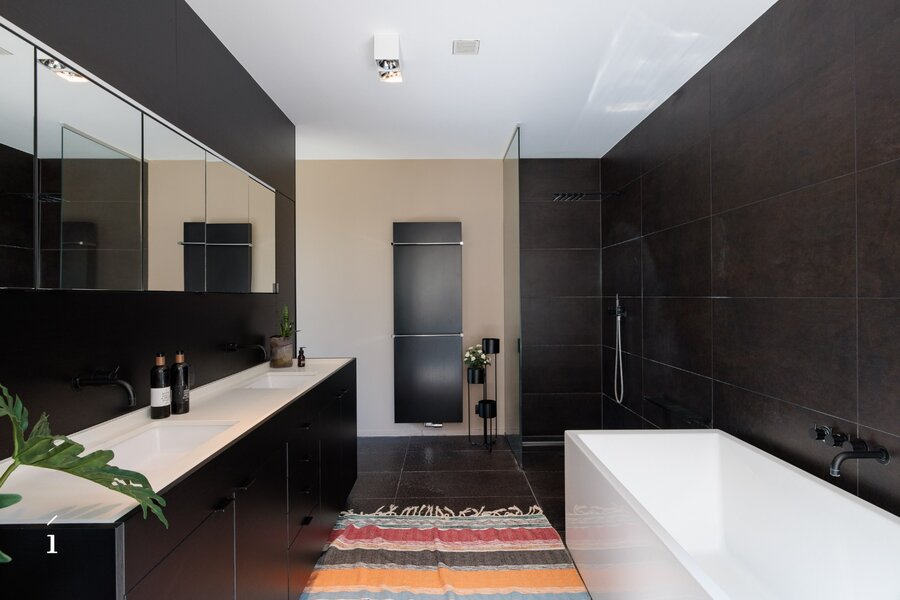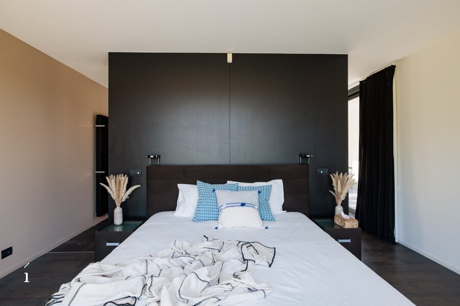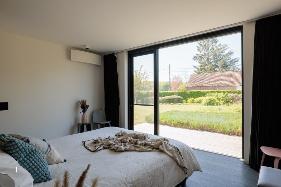 Op het gelijkvloers bevindt zich de masterbedroom met aansluitende dressing en elegante badkamer, uitgerust met inloopdouche, ligbad en dubbele wastafel. De verdieping omvat een nachthal met glazen wand, twee kinderkamers en een centrale badkamer, aangevuld met een apart toilet.
