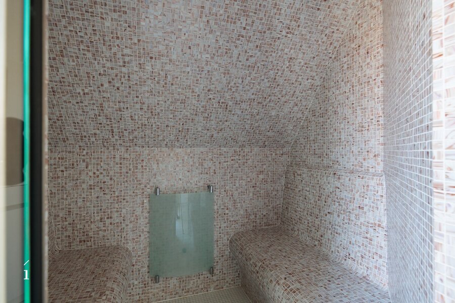 Verder beschikt het bijgebouw over een fitnessruimte en, op de verdieping, een gastenkamer met ruime badkamer voorzien van stoomcabine.