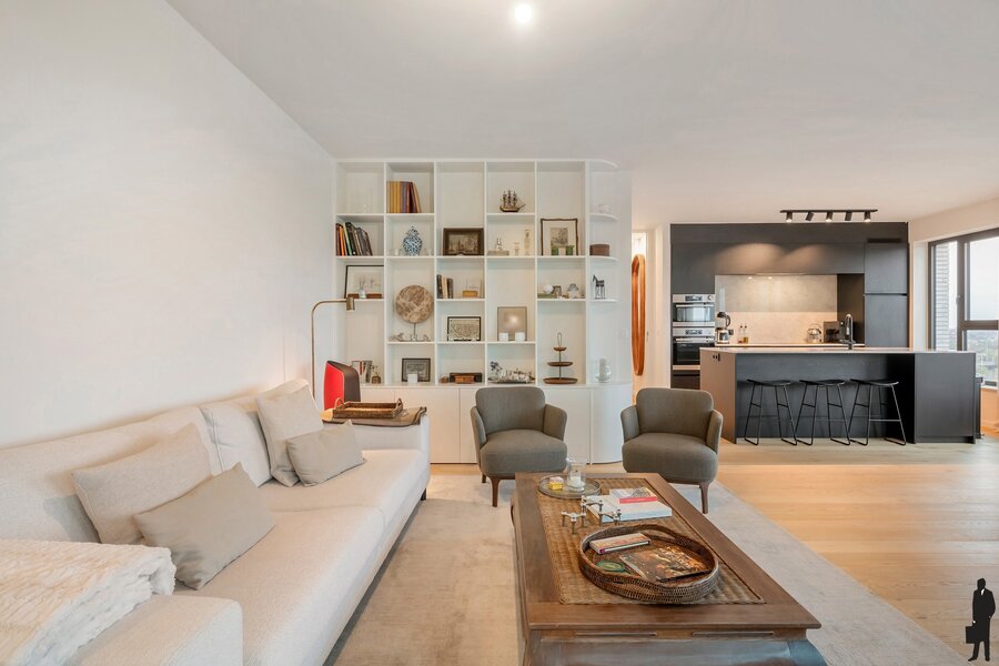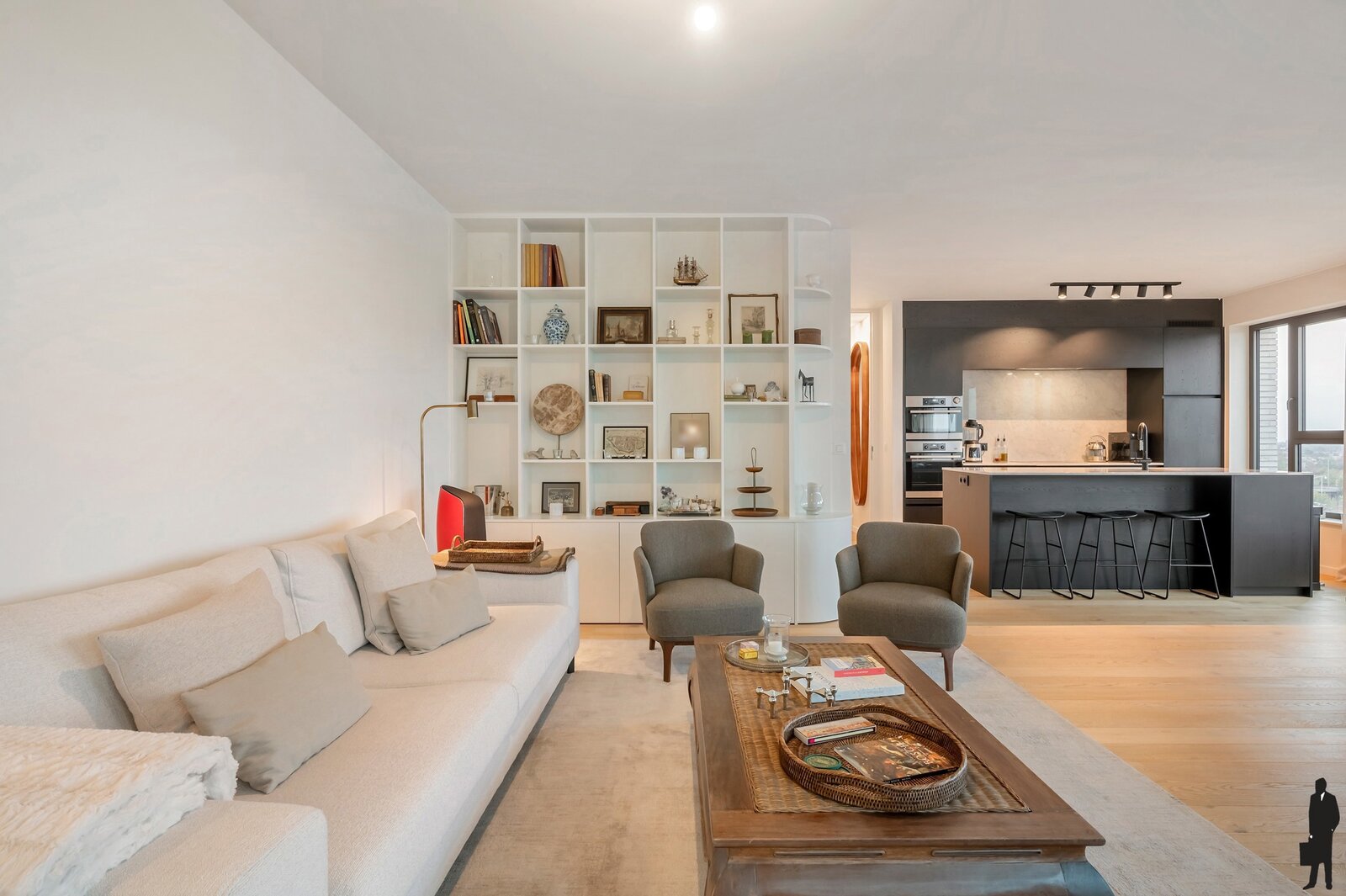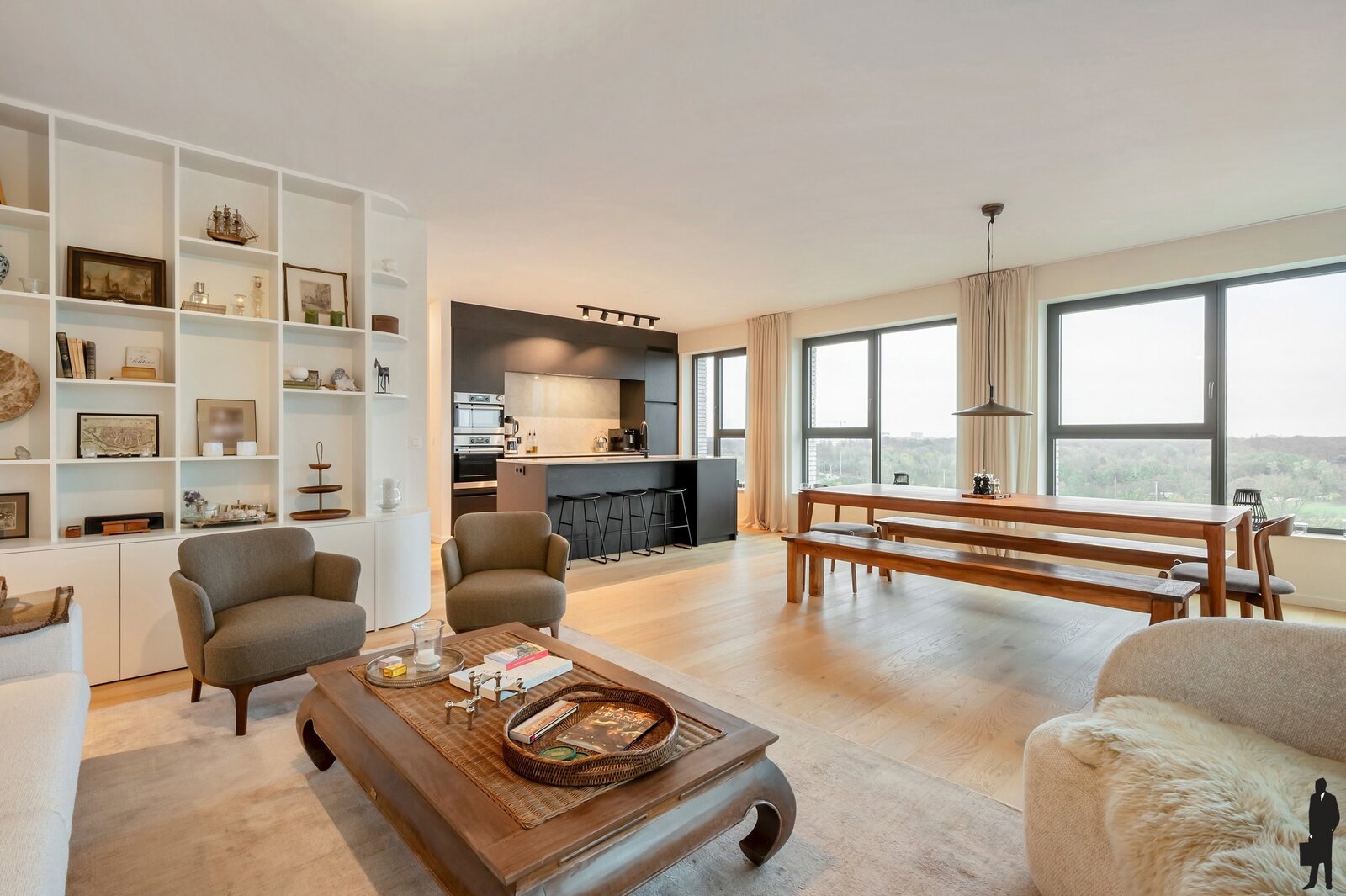 Het appartement omvat een bewoonbare oppervlakte van 134 m² en een terras van 11 m², perfect om in alle rust te genieten van de panoramische vergezichten. De ruime inkomhal met ingemaakte kasten en gastentoilet leidt naar de royale leefruimte met open keuken, afgewerkt met hoogwaardige materialen en ontworpen voor optimaal wooncomfort.