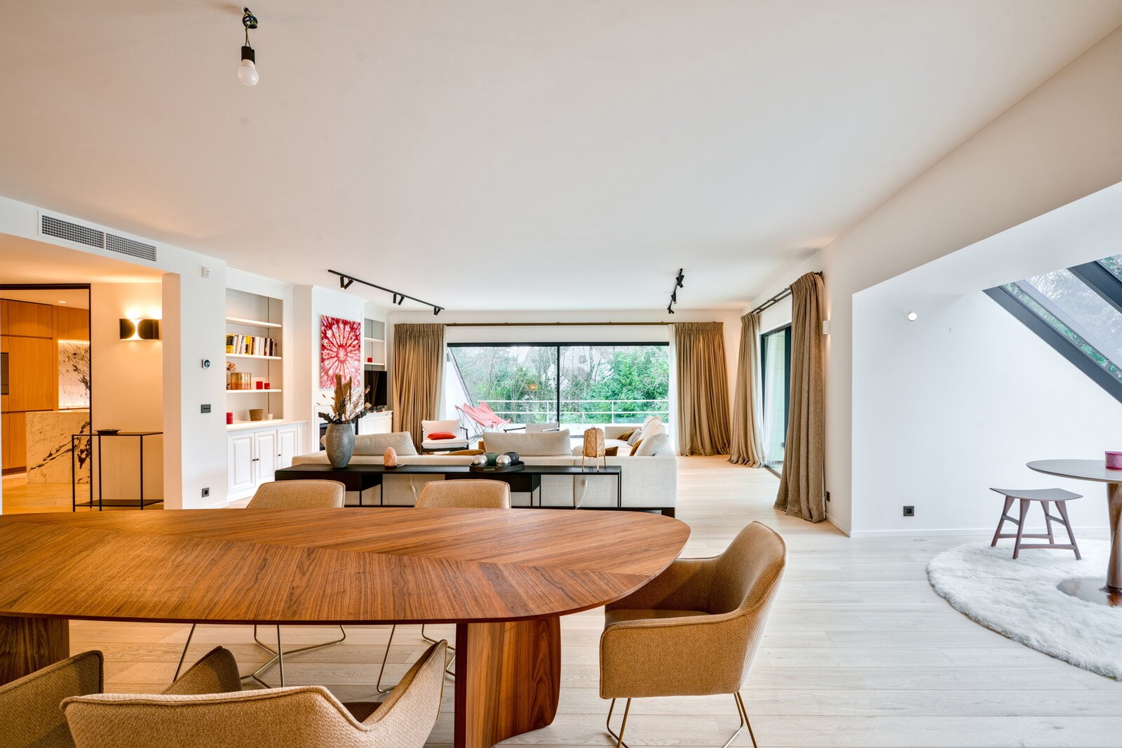 Close to Fort Jaco, in a very quiet and green setting, on the top floor of a small three-unit residence, superb penthouse duplex of approximately 235 m² with terraces. The apartment offers a large living room with a fireplace opening onto a south-facing terrace, a large, fully equipped Gaggenau kitchen with a breakfast area, and four bedrooms, including a spacious master suite. Each bedroom has built-in closets and a small adjoining terrace. It also includes three shower rooms and bathrooms. Renovated in 2022 with beautiful finishes, the apartment has never been occupied and is in almost new condition. A large garage for two cars, a cellar, outdoor parking spaces, air conditioning, a reinforced door, and an alarm system complete this exceptional property. It is also possible to rent it furnished.