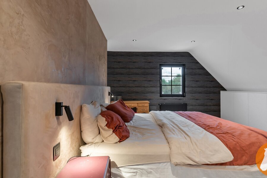 Via de houten trap in de inkomhal bereik je de bovenverdieping. Hier bevinden zich drie slaapkamers en een verzorgde badkamer met bad, douche en dubbele lavabo. De warme en harmonieuze stijl van de benedenverdieping wordt ook hier verder doorgetrokken.