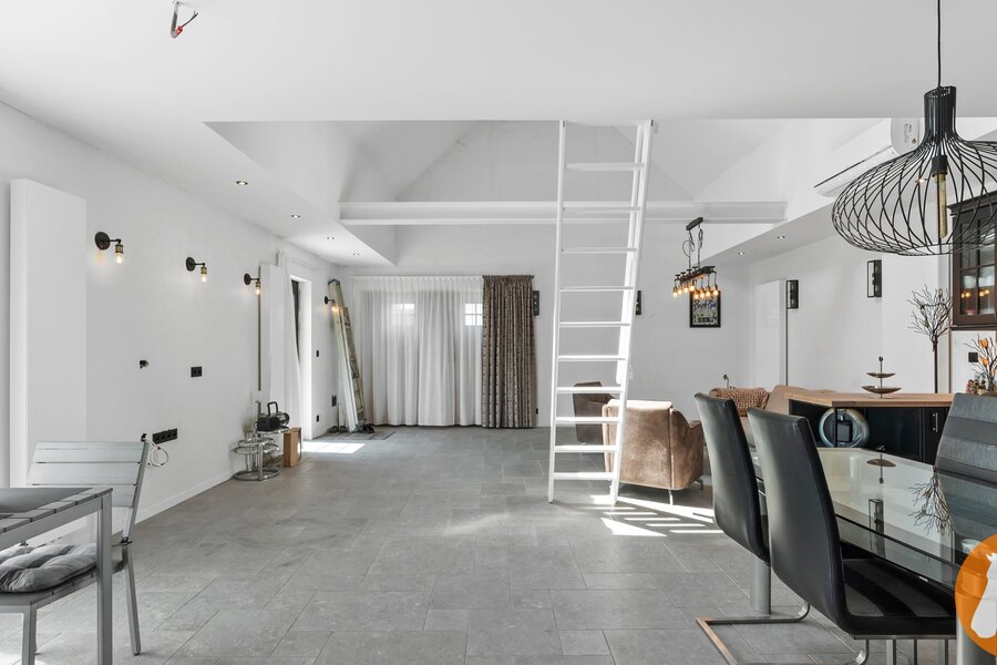 Vanuit de ruime leefruimte en eetplaats geniet je van een mooi zicht op het terras en de tuin, waardoor binnen en buiten naadloos in elkaar overlopen.