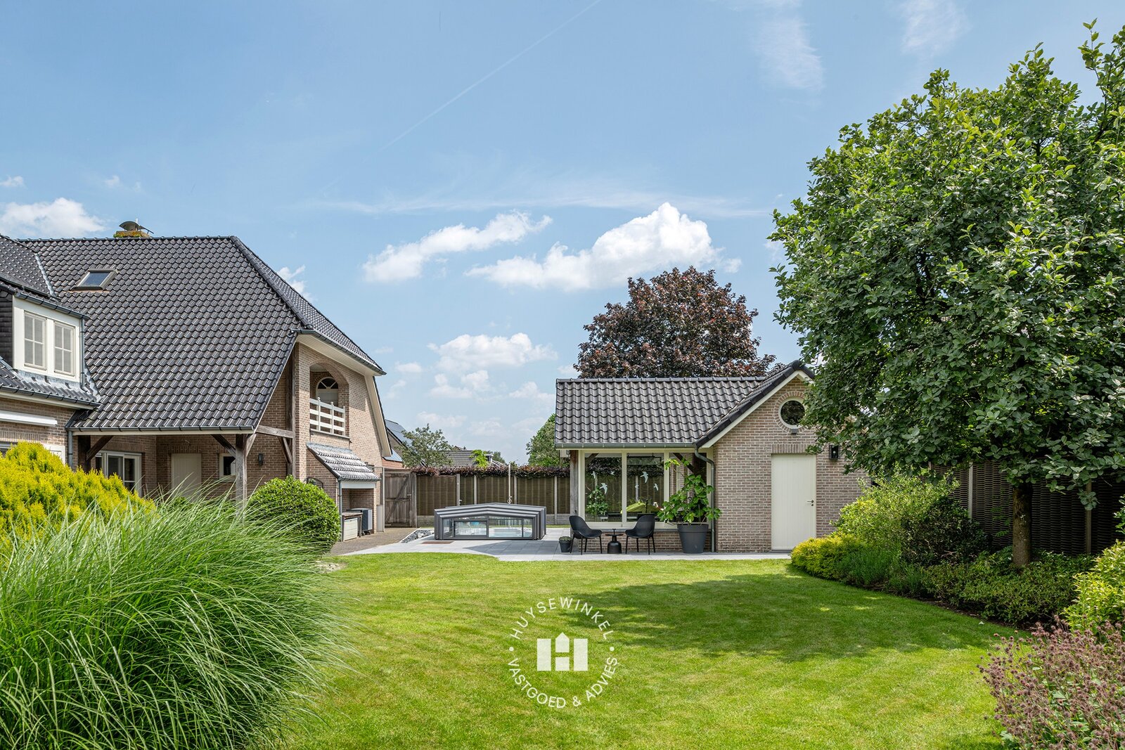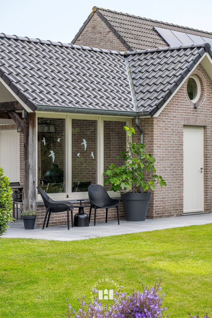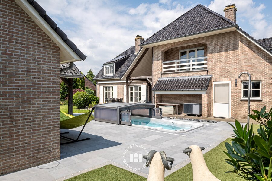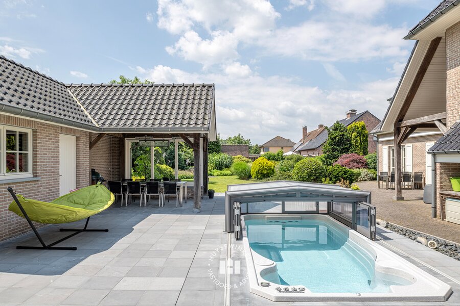 Verder is er een poolhouse en plungepool met tegenstroom. Het poolhouse in de tuin is uitgerust met een bijkeuken en bergplaats. Het overdekte patio terras heeft zicht op de tuin en maakt dit dan ook de perfecte plek voor een BBQ of apéritief.
