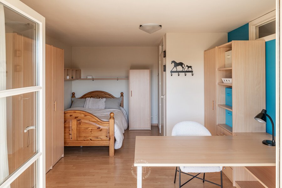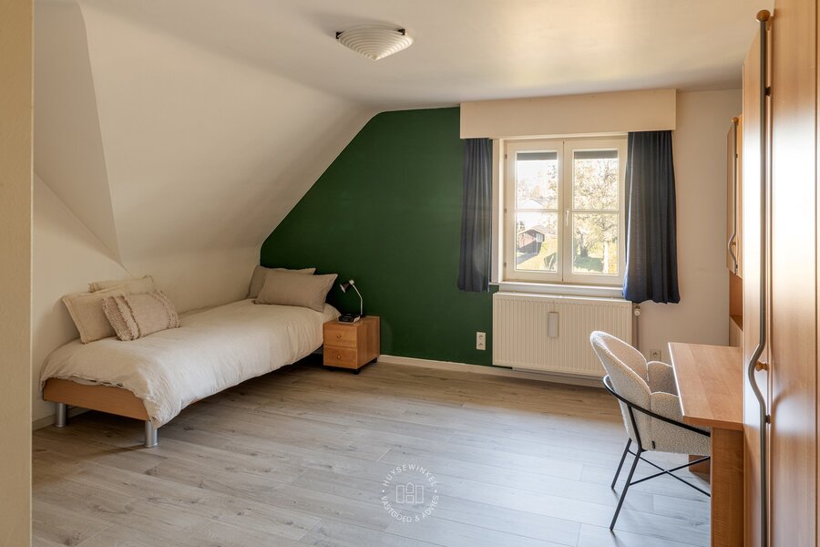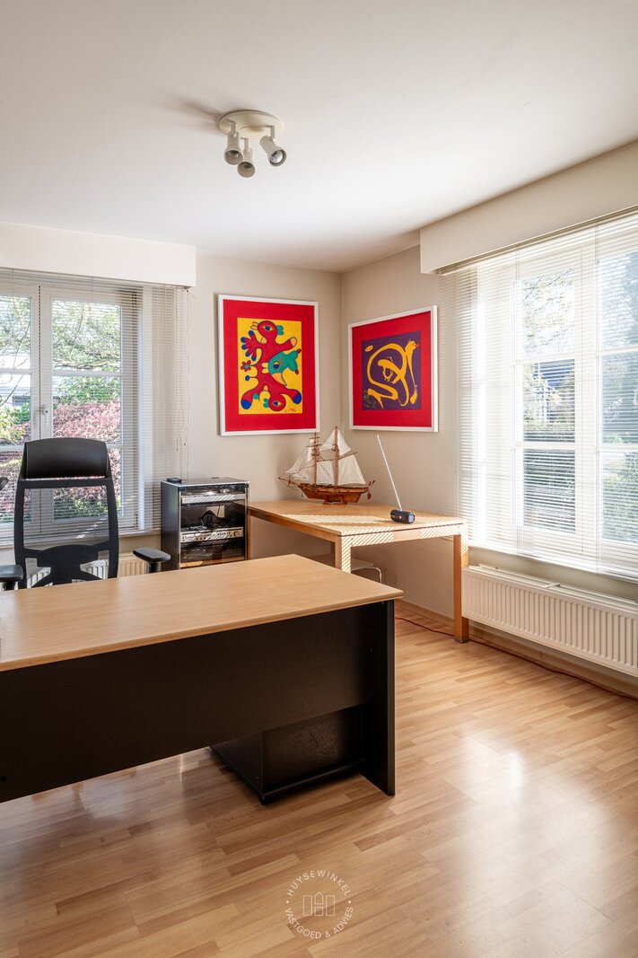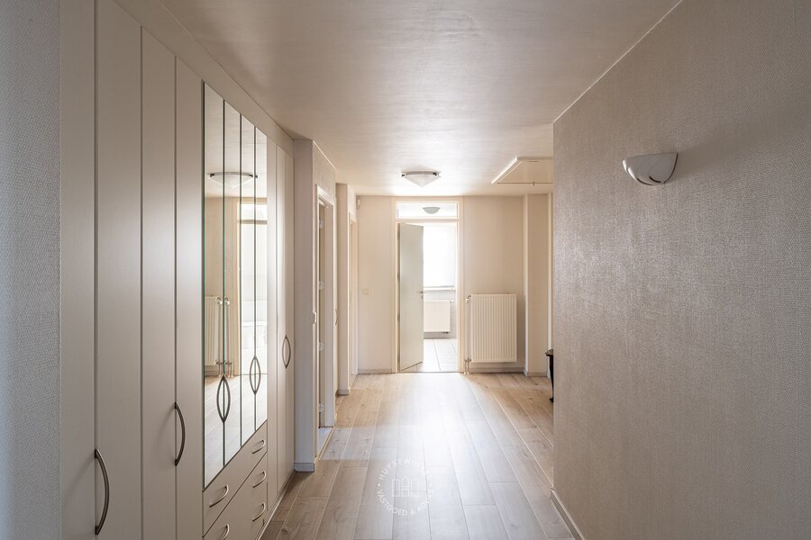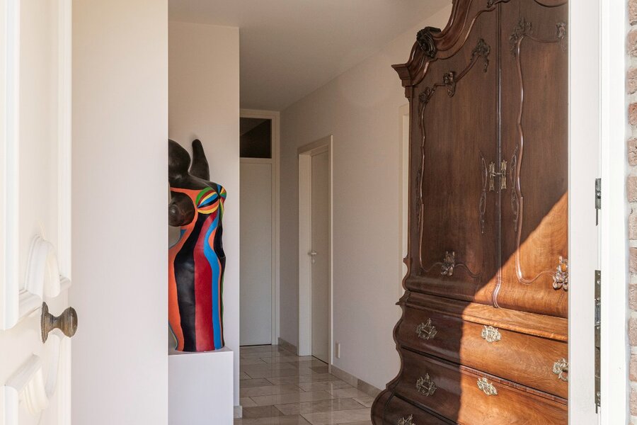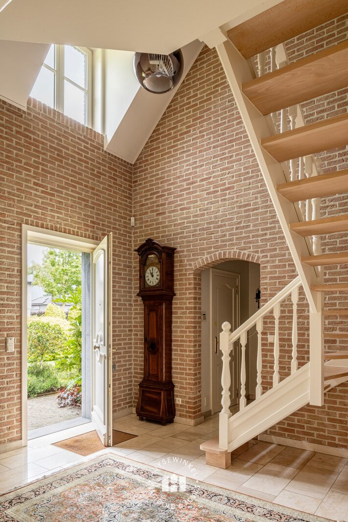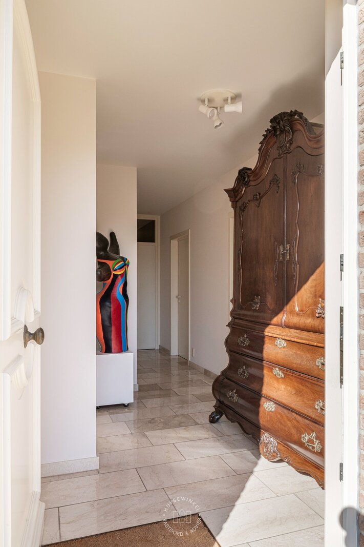 De zij entree van deze villa geeft het pand een multifunctioneel karakter. Zo is er hier een afzonderlijke toegang voorzien tot een dubbele ruimte waardoor de woonfunctie vlot gecombineerd kan worden met een kantoor, praktijk of kangoeroe woonst. Verder is er op de gelijkvloerse verdieping nog een inpandige garage met bergplaats aanwezig alsook sauna met douche. De volhouten trap geeft toegang tot de slaapverdieping. Op de slaapverdieping zijn maar liefst vijf slaapkamers voorzien alsook twee volwaardige badkamers elk uitgerust met een bad, douche en dubbele lavabomeubel. Praktisch zijn de wasplaats, dressingruimte alsook ingemaakte kastenwand terug te vinden in de nachthal.