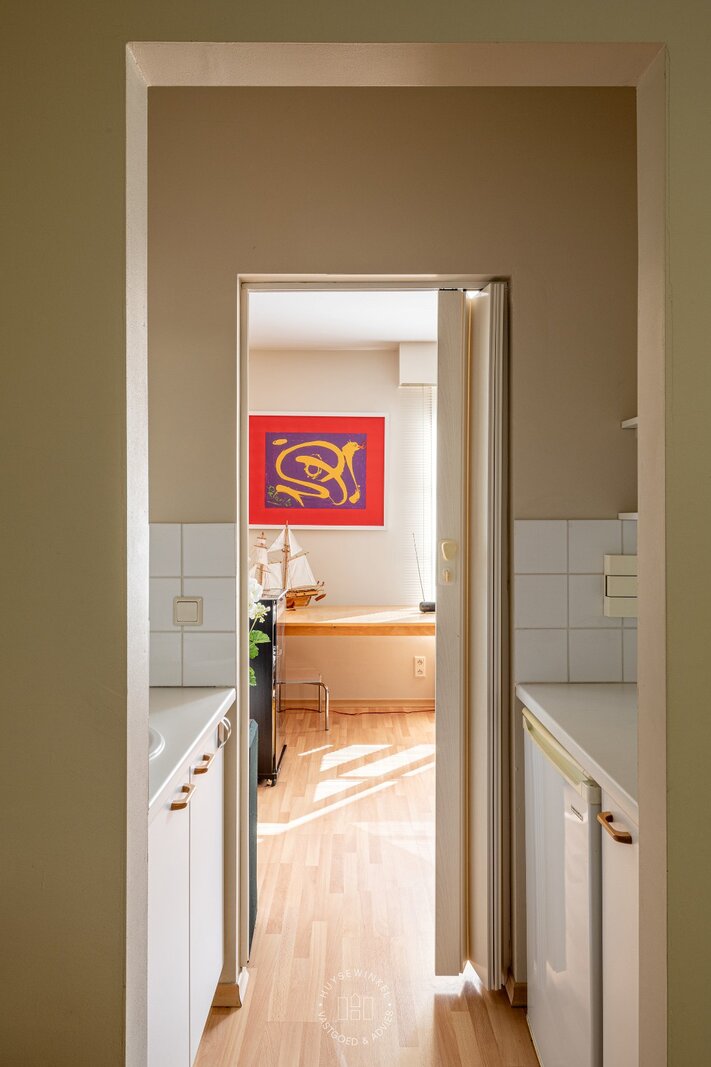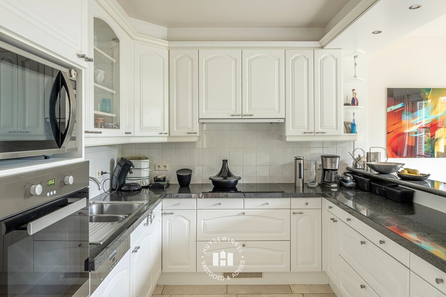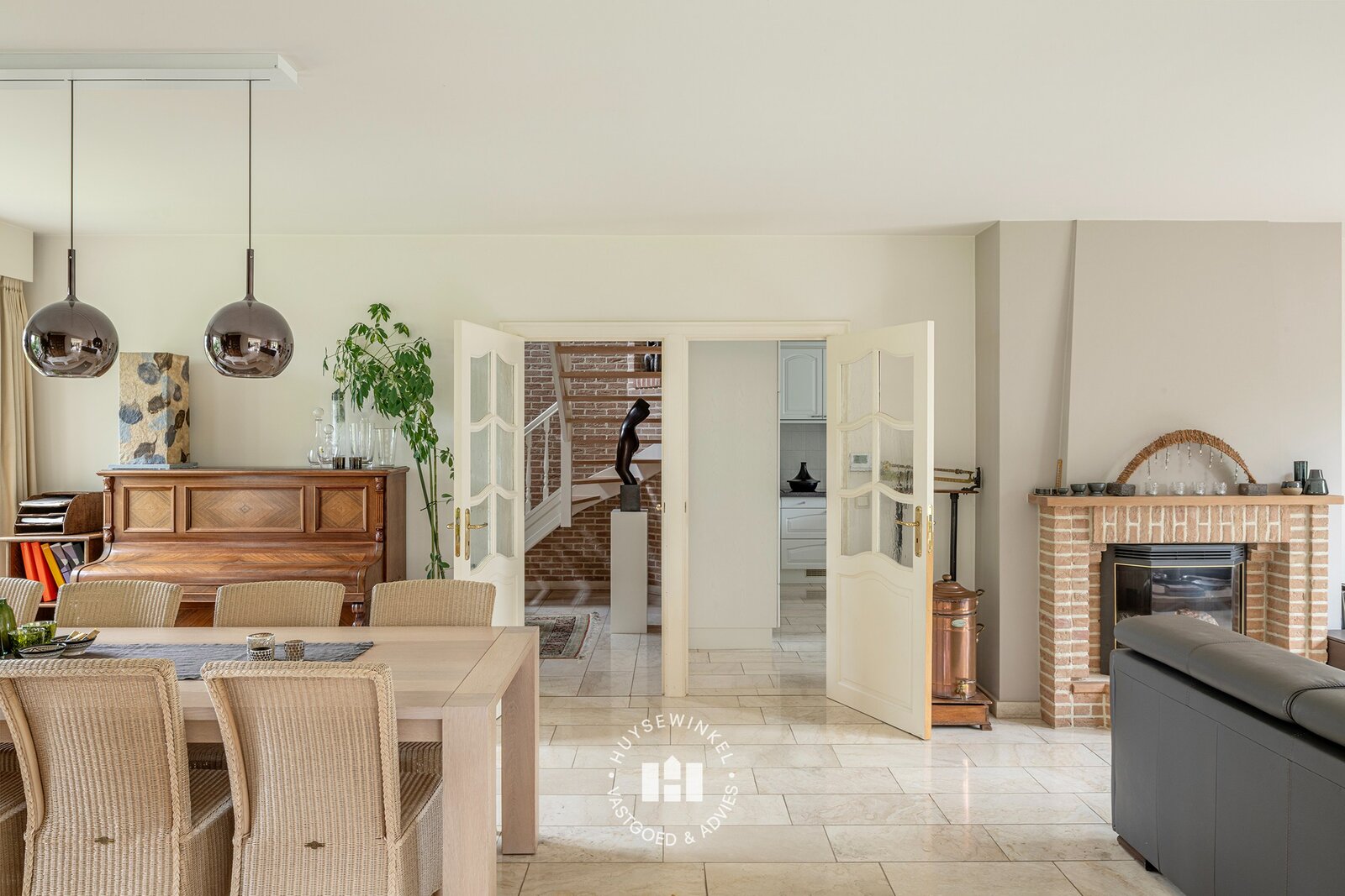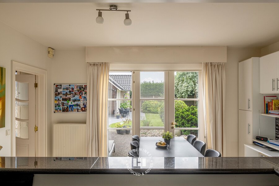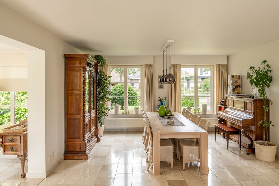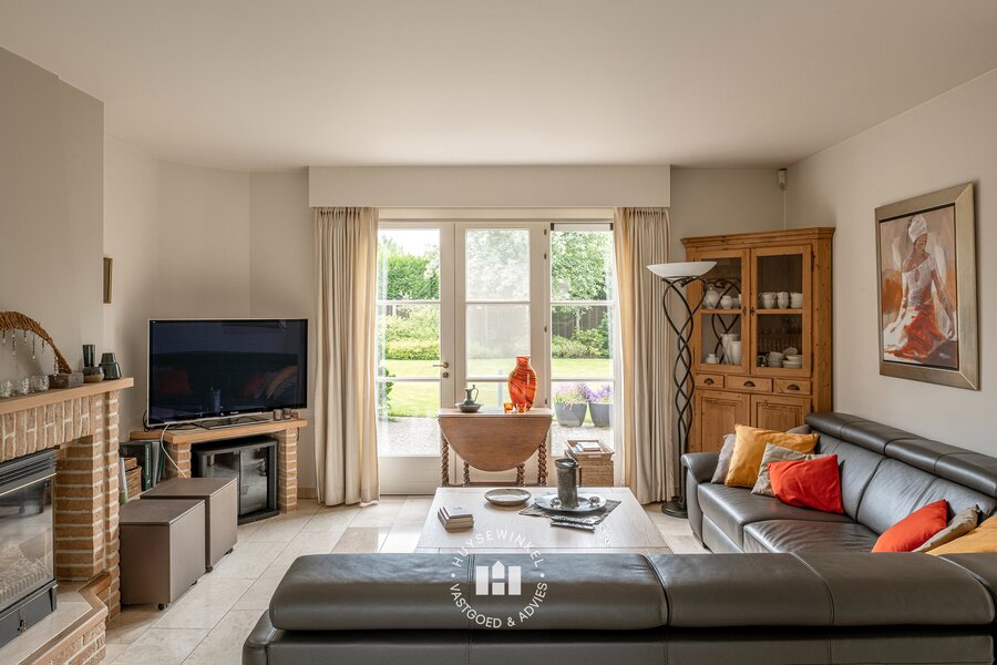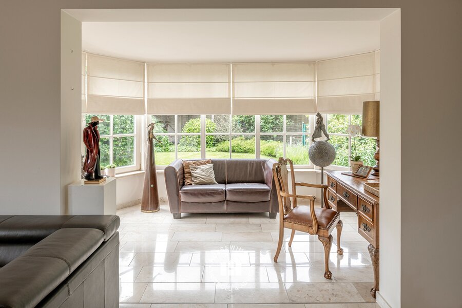 De doorzonliving is voorzien van leeshoek, zitgedeelte alsook eetplaats en heeft langs beide kanten contact met tuin. De combinatie van de grote raampartijen met zicht op de tuin en open haard zorgen voor het ultieme thuisgevoel. Aansluitend is er de leef keuken met ontbijthoek welke eveneens in connectie staat met de tuin doormiddels van verschillende terrassen. Verder is er een praktische bijplaats momenteel in gebruik als bureel.