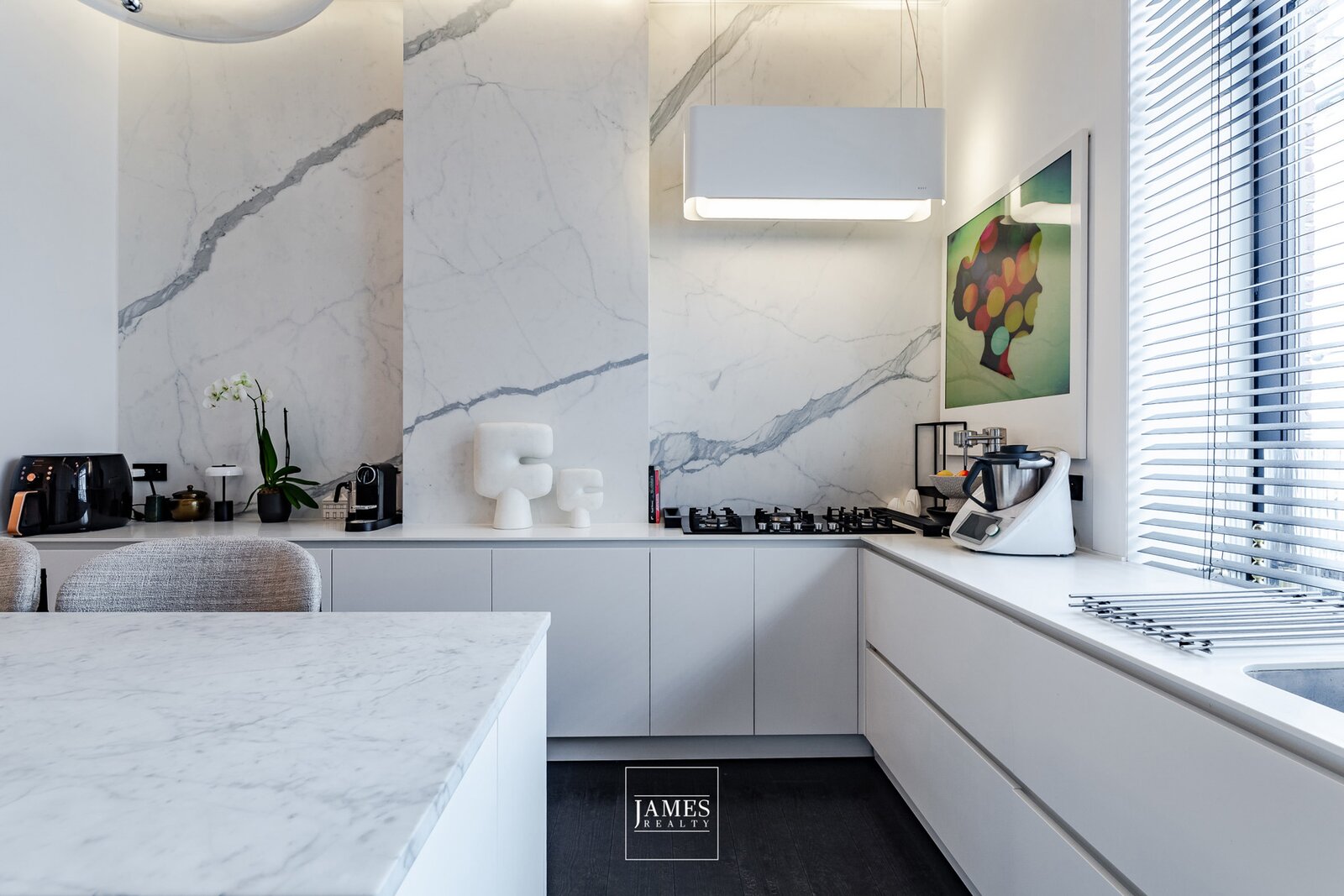 The ground floor is organized around a semi-open kitchen leading to the dining room, while the spacious garden-facing living room, enhanced by a custom-built library, opens pleasantly onto the garden.