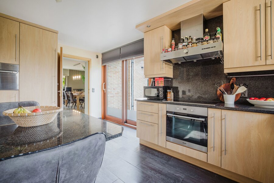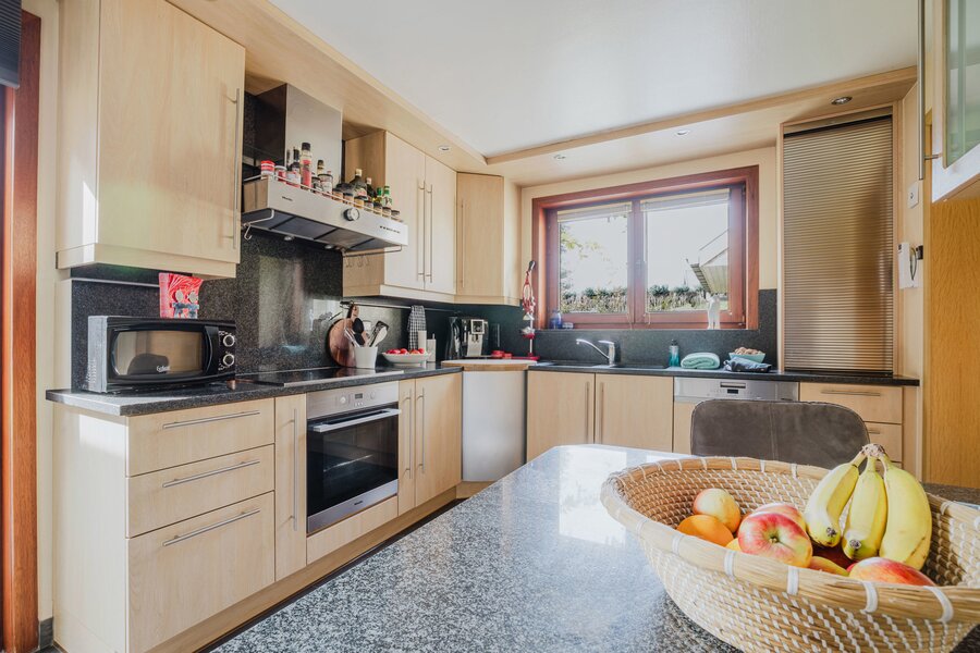 This move-in ready and well-maintained property welcomes you into a spacious entrance hall featuring a guest toilet and a practical built-in cupboard. On one side is an exceptionally spacious and light-filled living room, adjoining a study – ideal for working from home or as a hobby room. The living area flows seamlessly into a fully fitted, modern kitchen offering every convenience.