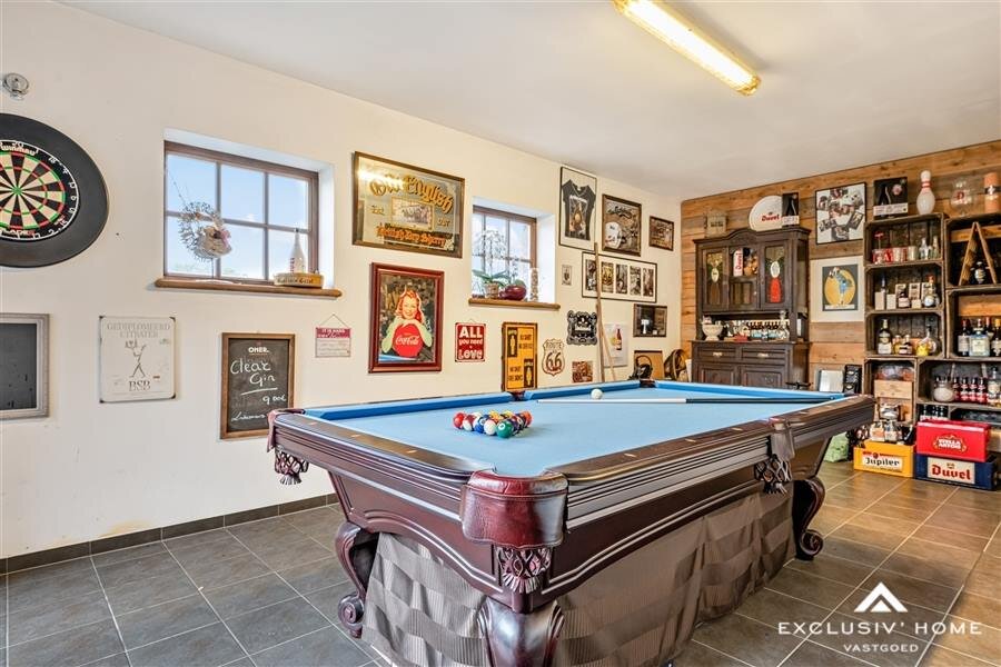 The residential house is characterised by a large living area (150m²) with different atmospheric rooms, four bedrooms, 2 luxurious bathrooms, a office room, indoor garage as well as a large hobby room on the ground floor.