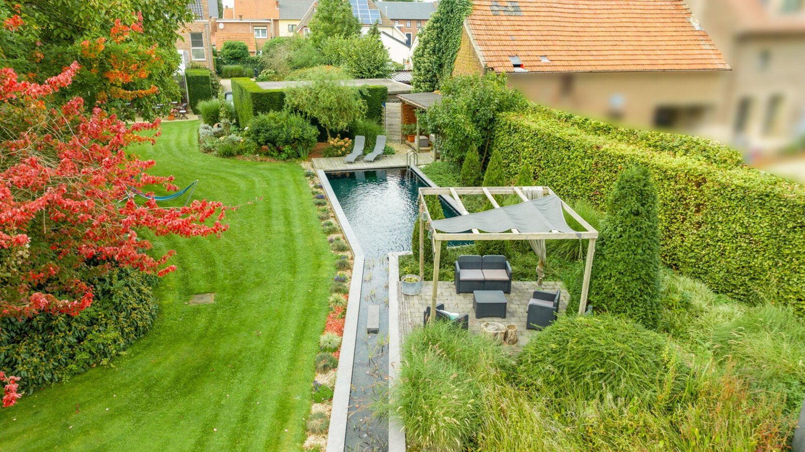 De charmante tuin, zwembad, jacuzzi, buitendouche en barrel-sauna (ton- sauna) met Harvia kachel, maken het buitengebied nóg aangenamer. De eigendom is volledig omheind. Een volgroeide hoge beukenhaag van 2,50 m hoog biedt volledige privacy. Waterpartijen, terrassen, plantenzones wisselen elkaar af en geven de ruime tuin een speciaal cachet.