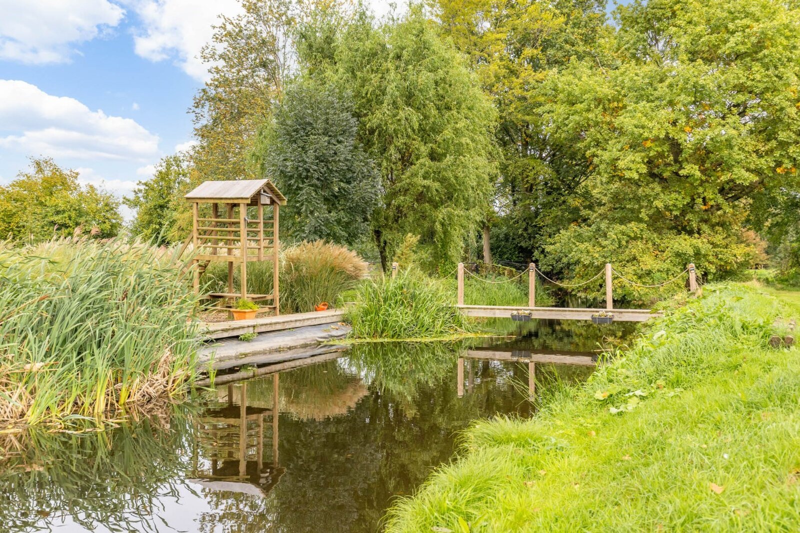 Wat de waterpartijen betreft : zwembad (10 m x 4 m en 1,40 m diep), vijver (vissen), natuurlijk zwemvijver. De ganzen hebben hun eigen domein en ze zwemmen in de Ziepbeek die door de eigendom passeert. Een houten brug brengt ons naar het verste deel van de tuin. Hier is groen en beplanting. De houten uitkijktoren staat op de achterste perceelsgrens.