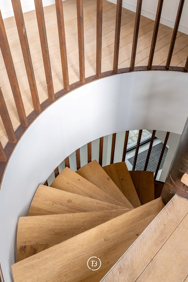 Op de eerste verdieping vinden we meerdere open leefruimtes, een keuken en een badkamer. Het tweede verdiep is momenteel casco en biedt samen met het eerste verdiep de mogelijkheid om een duplexappartement te creëren, perfect voor wie wonen en werken wil combineren.