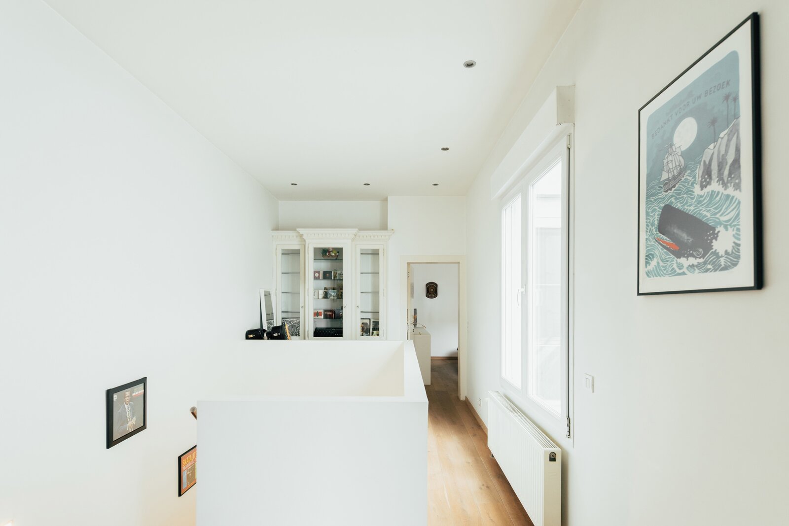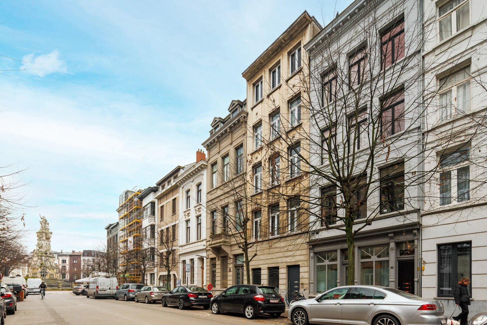 This spacious duplex apartment occupies the ground floor and first floor of an elegant townhouse, instantly offering a true home-like feel. On the ground floor, the living areas feature solid oak parquet flooring: a TV room at the front, followed by a cosy lounge with gas fireplace, and at the rear a generous, fully equipped open-plan kitchen with Boretti range cooker, white marble finishes, ample custom-made storage and a charming dining area beneath the skylight. The beautiful skylight and the seamless connection to the sunny, south-facing garden create a wonderful indoor-outdoor atmosphere. The city garden offers a high degree of privacy, thanks to the church located behind it. There is also a large private cellar with laundry area and wine storage.