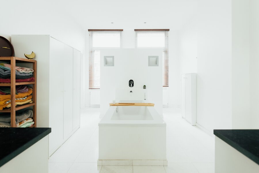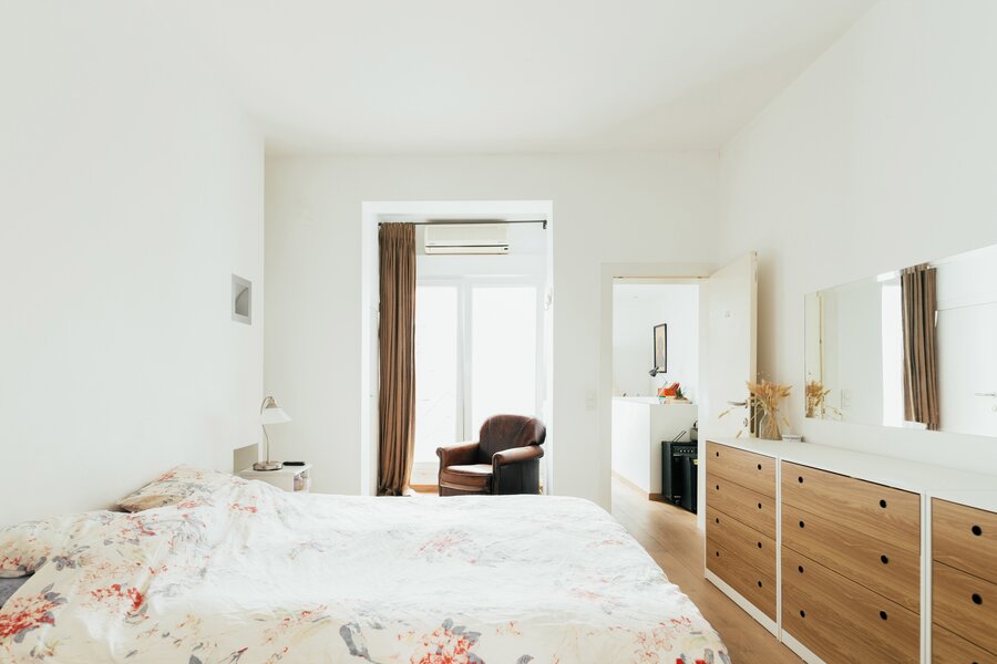 Stairs lead to the first floor: at the rear, a shower room. At the front, the master bedroom opens onto a spacious bathroom with a designer bathtub, double washbasin and, beyond it, a second, smaller bedroom — ideal as a home office, child’s room or guest bedroom, accessible via the bathroom only.