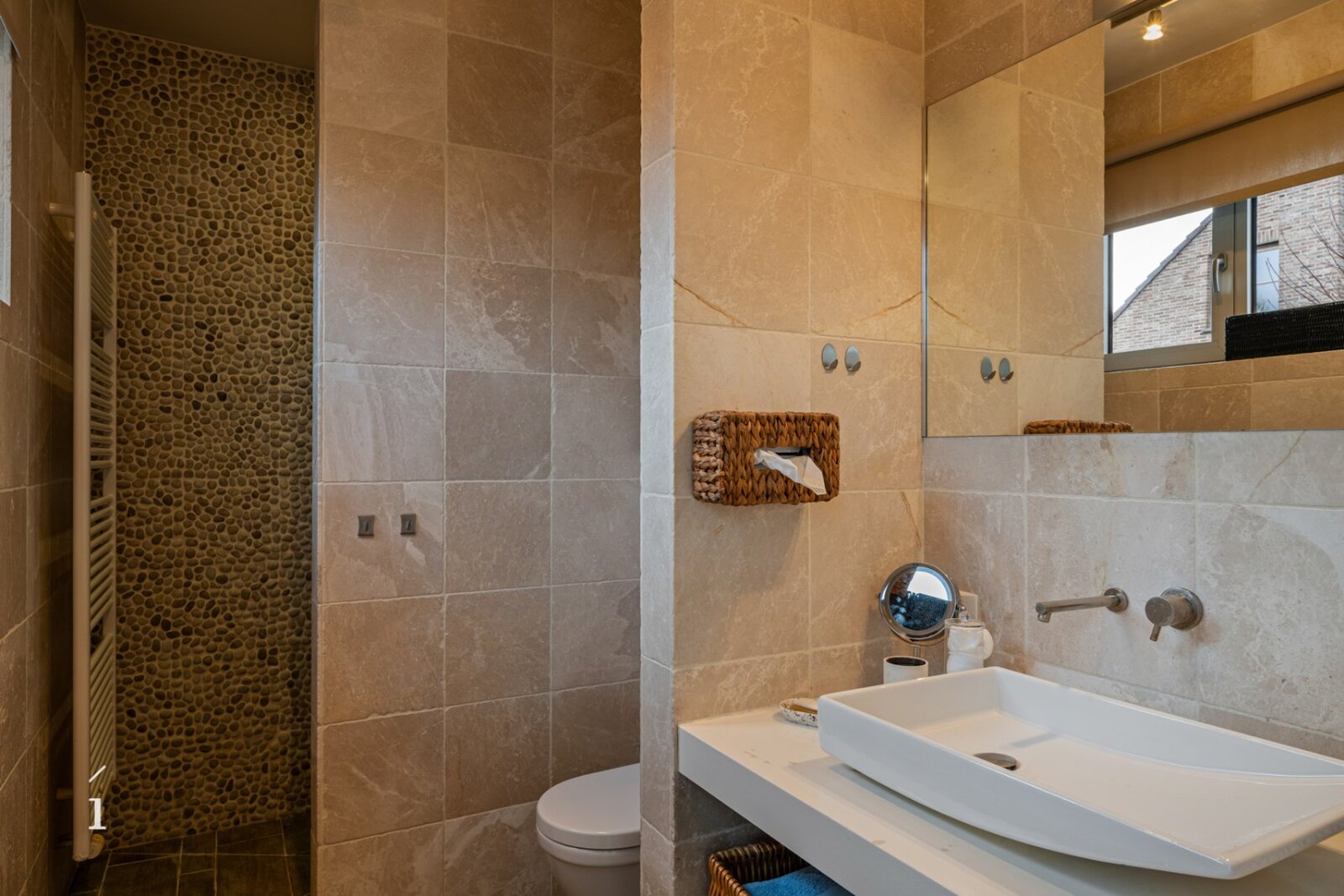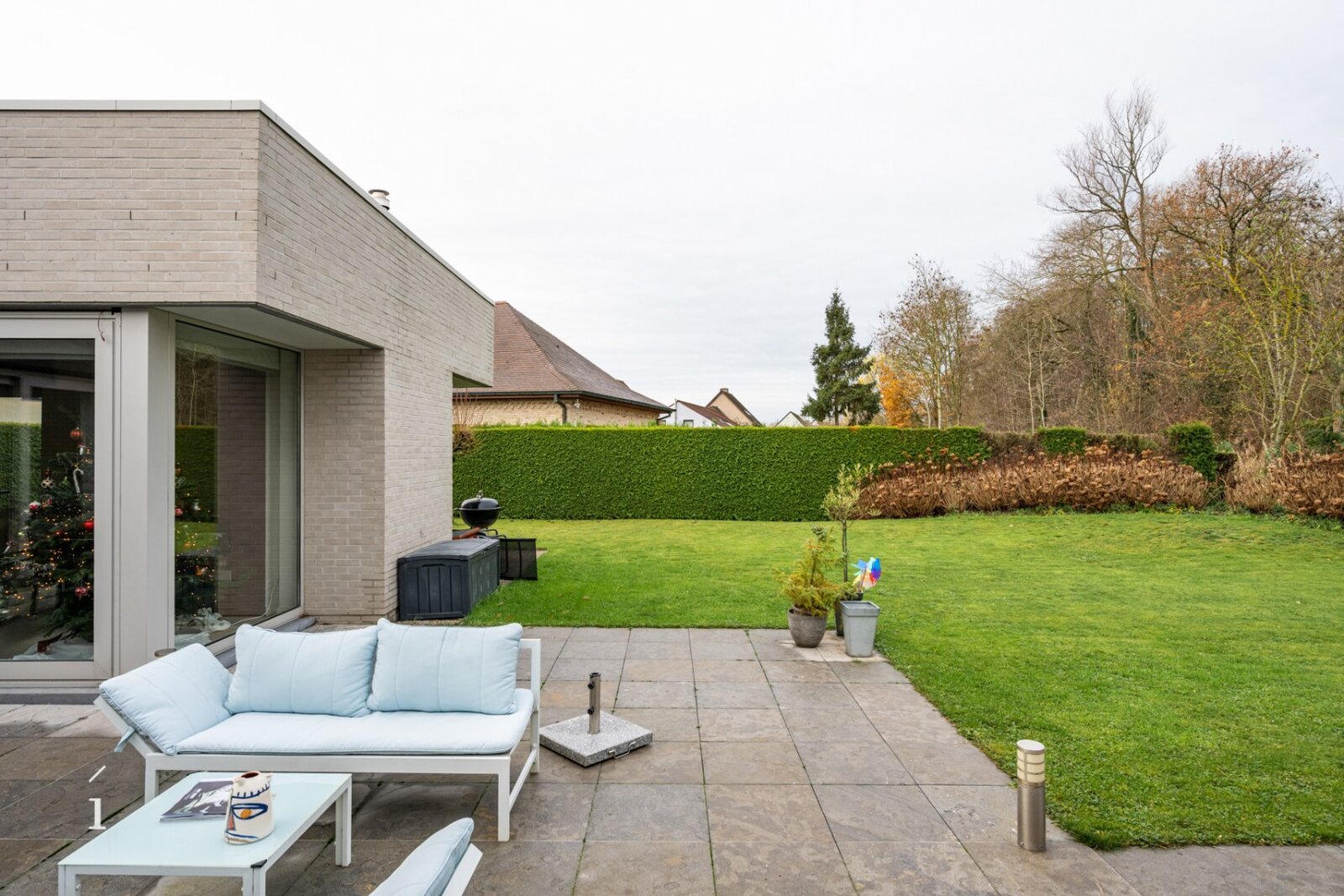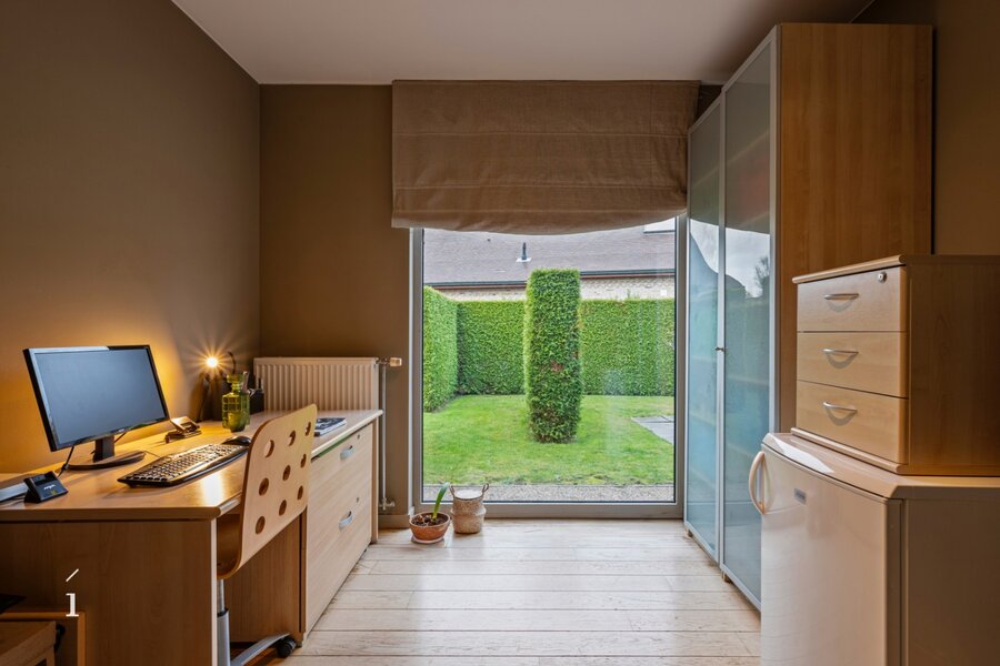De lichtrijke leefruimte omvat een open, volledig geïnstalleerde keuken met keukeneiland en eethoek, afgewerkt met kwalitatieve materialen en toestellen. Daarnaast bevindt zich de zithoek, volledig omringd door glaspartijen en genietend van een prachtig zicht op de fraai aangelegde tuin. Voor extra sfeer en gezelligheid is de zithoek uitgerust met een ingebouwde gashaard.
